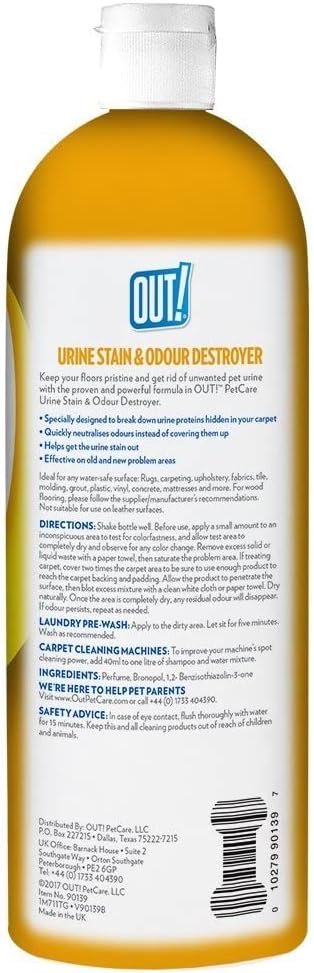 OUT! Urine Destroyer eliminates the toughest dog and cat urine odours and stains with a proven and powerful formula. Urine Destroyer uses a natural Pro-Bacteria and enzyme formula that eliminates urine stains, odours and pheromones. Quickly neutralises odours instead of covering them up and eliminates remarking so pets won’t revisit and re-soil the same spots. Effective on old and new problem areas, and is ideal for any water-safe surface like carpeting, rugs, upholstery, fabrics, tile, sealed wood, plastic, vinyl, concrete, mattresses, and trash containers. Safe around pets and children when used as directed.