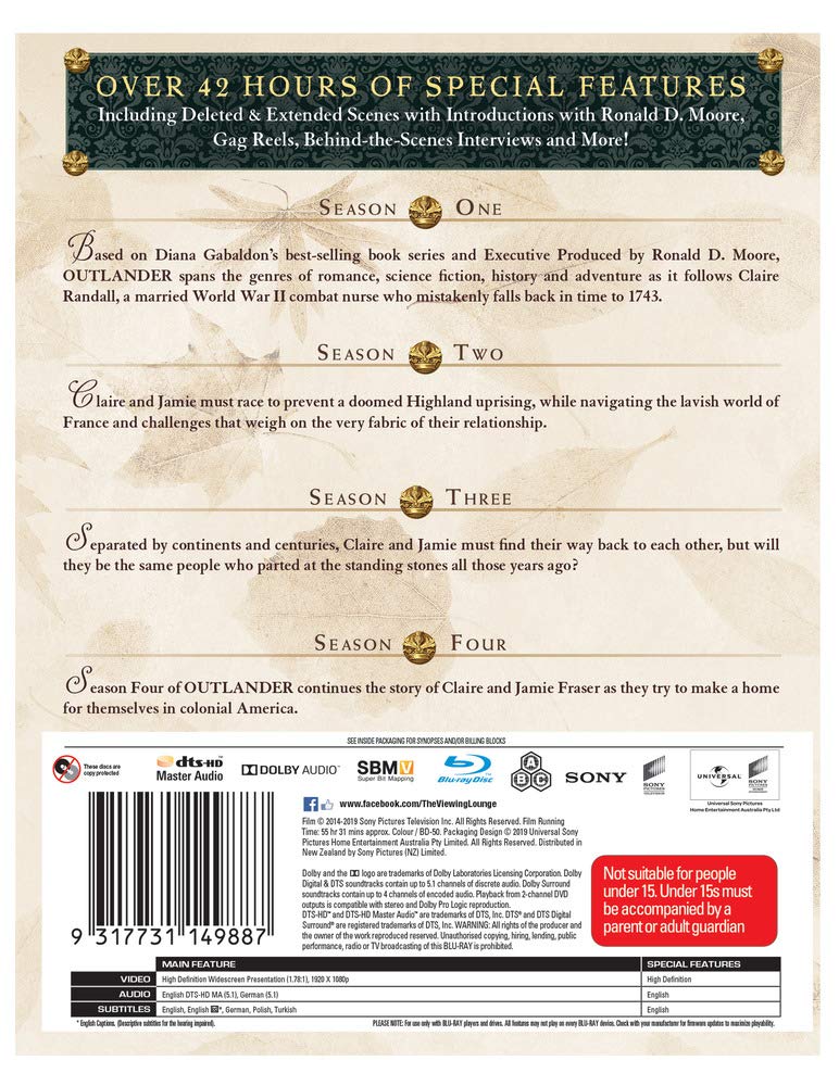 Australia released, Blu-Ray/Region A/B/C : it WILL NOT play on regular DVD player. You need Blu-Ray DVD player to view this Blu-Ray DVD: LANGUAGES: English ( DTS 5.1 ), English ( DTS-HD Master Audio ), German ( Dolby Digital 5.1 ), English ( Subtitles ), German ( Subtitles ), Polish ( Subtitles ), Turkish ( Subtitles ), WIDESCREEN (1.78:1), SPECIAL FEATURES: Alternative Footage, Behind the scenes, Box Set, Cast/Crew Interview(s), Deleted Scenes, Interactive Menu, Multi-DVD Set, Scene Access, SYNOPSIS: Follows the story of Claire Randall, a married combat nurse from 1945 who is mysteriously swept back in time to 1743, where she is immediately thrown into an unknown world in which her life is threatened. When she is forced to marry Jamie Fraser, a chivalrous and romantic young Scottish warrior, a passionate relationship is ignited that tears Claire’s heart between two vastly different men in two irreconcilable lives. SCREENED/AWARDED AT: Golden Globes, …Outlander – Complete Series 1-4 – 21-Disc Box Set