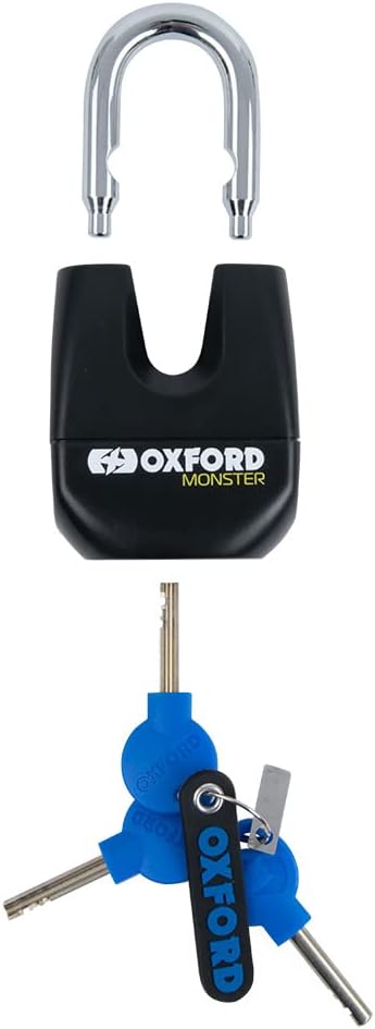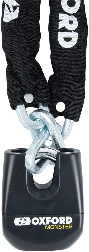 The Oxford Monster chain and padlock has a 12mm square chain made from Ni-Cro-Mo alloy steel and covered in a protective sleeve to help protect your paintwork. The Ultra strong padlock has hardened boron steel armour casing, 11mm hardened steel shackle and comes with three keys. Key replacement service available. Simply keep the key number in a safe place then if you are unfortunate enough to lose all your keys, a spare can be made up for you. The chain lock has been rigorously tested both independently and by Oxford and is Sold Secure and Thatcham approved.