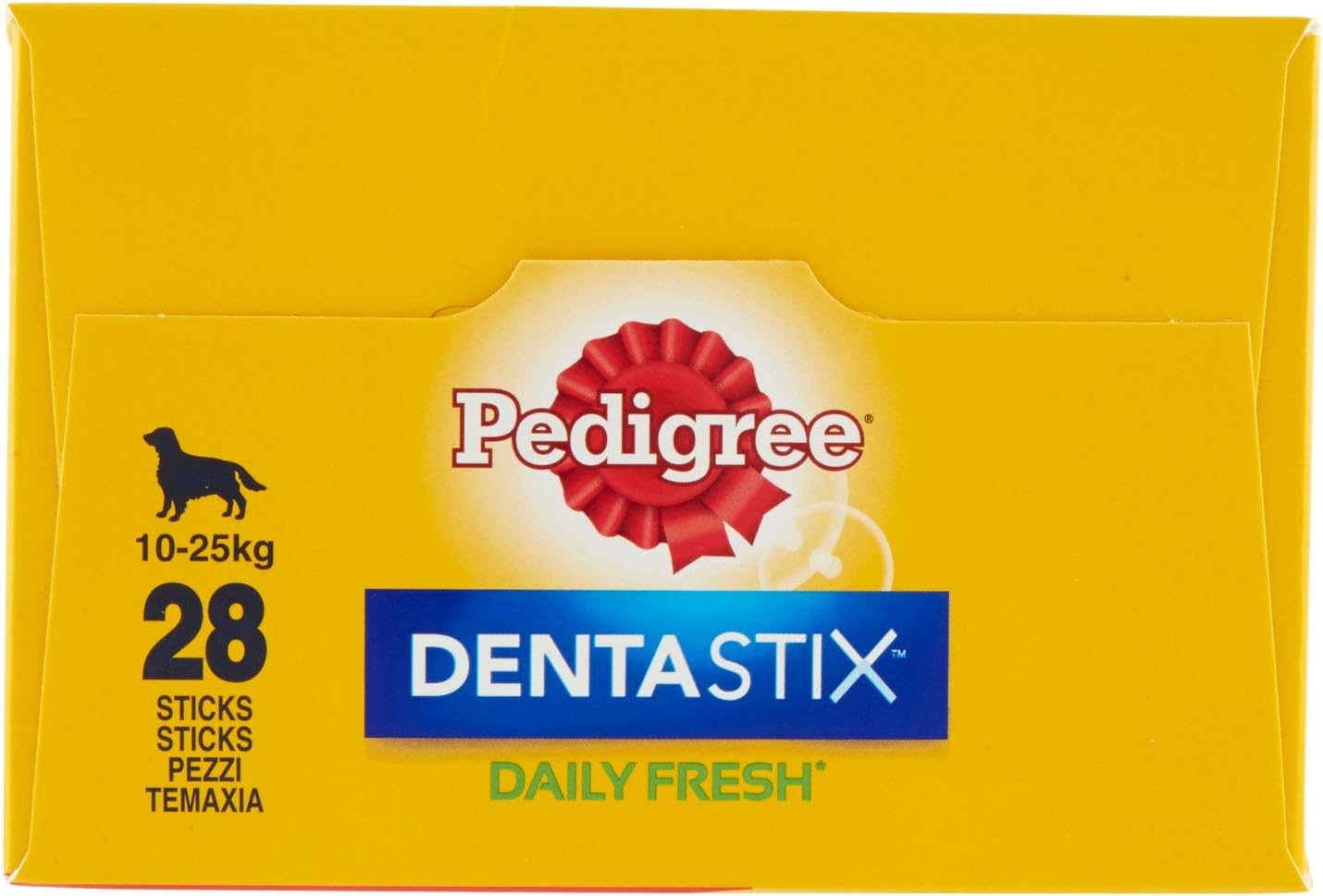 Pedigree Dentastix Fresh 28 Sticks are tough, X-shaped chews that have been created to help clean teeth and freshen breath of dogs. Designed with a unique X-shape and texture, the chews are resilient to your dog’s chewing and will help to reach those hard to reach places between teeth and gums. With regular use, Dentastix Fresh chews can eliminate plaque and tartar build up by 80% without the hassle of regular brushing. Dentastix Fresh chews have also had a new patented ingredient which contains green tea extract and eucalyptus oil which has been proven to freshen breath. Each chew is free from artificial colours and flavours. Chews are available for Small, Medium and Large Dogs. Please refer to the guide below for the correct size. ??? Small – For dogs weighing between 5-10kg??? Medium – For dogs weighing between 10-25kg??? Large – For dogs weighing over 25kg