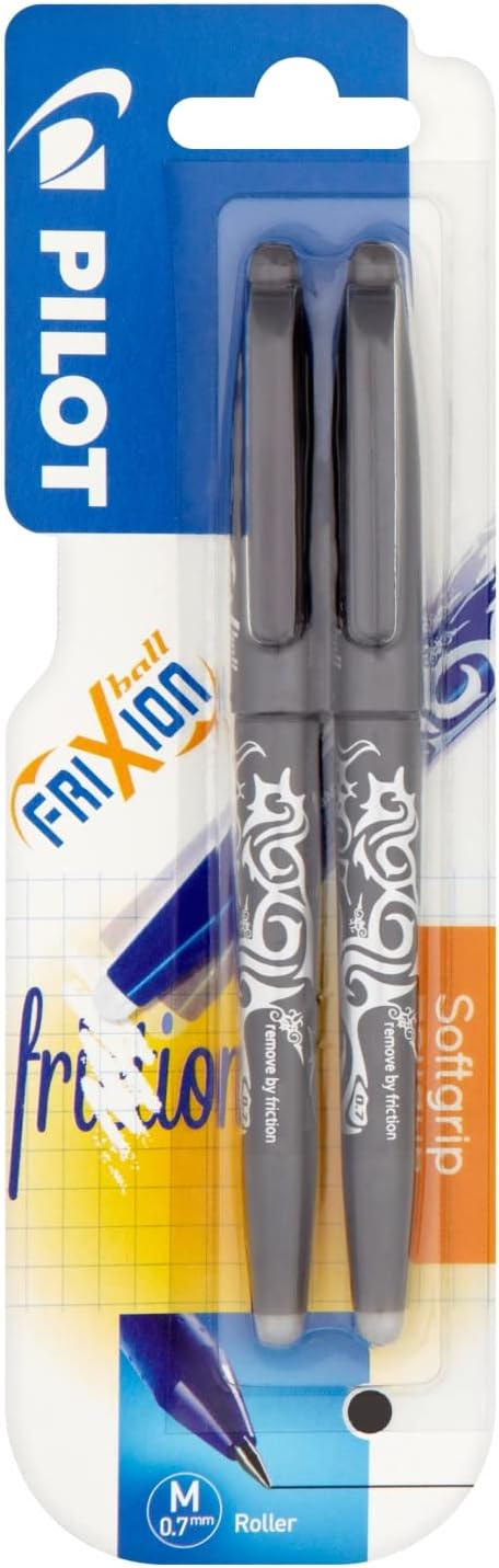 Frixion rollerball pen. Cap model. Type designation of the mine: 2261. Type of writing fluid: liquid ink. Mine version: stainless steel tip, 0.4 mm (≙ 0.7 mm ball diameter), replaceable mine. Pin design: plastic, rubber coating. Clip material: plastic. With the rubber tip at the end of the shaft the friction can be rubbed away (friction heat > 65 °C) and in cold conditions (< 15 °C) the writing appears again. Colour of the shaft: in the same colour of the ink.