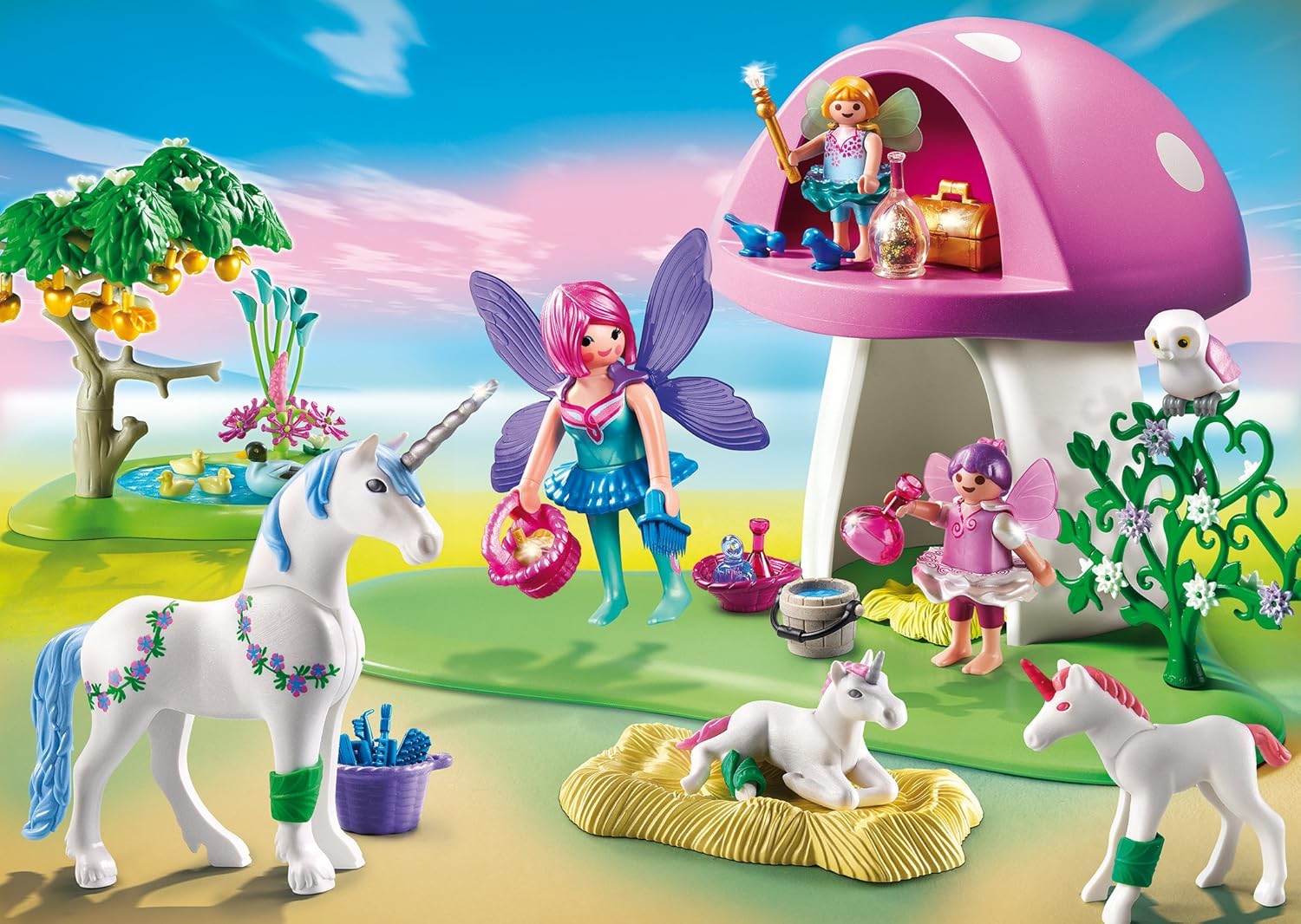 Visit the magical fairy world at their Toadstool House. Here, the fairies use their powers to look after their unicorn friends, using leaf bandages to wrap up any wounds and special potions to help them heal. In the giant toadstool home, the fairies live upstairs while the unicorns can find shelter in the base. Pick some golden apples from the tree, and you’ve got a delicious snack for both the fairies and unicorns. Set includes one adult fairy, two child fairies, unicorn, unicorn foals, potion bottles, golden chest, bandage and grooming tools, duck pond, and other fun accessories. Recommended for ages four to ten. This item is packaged in a clear plastic bag or brown cardboard box. It does not come in colorful retail packaging. Please consider this when gifting.