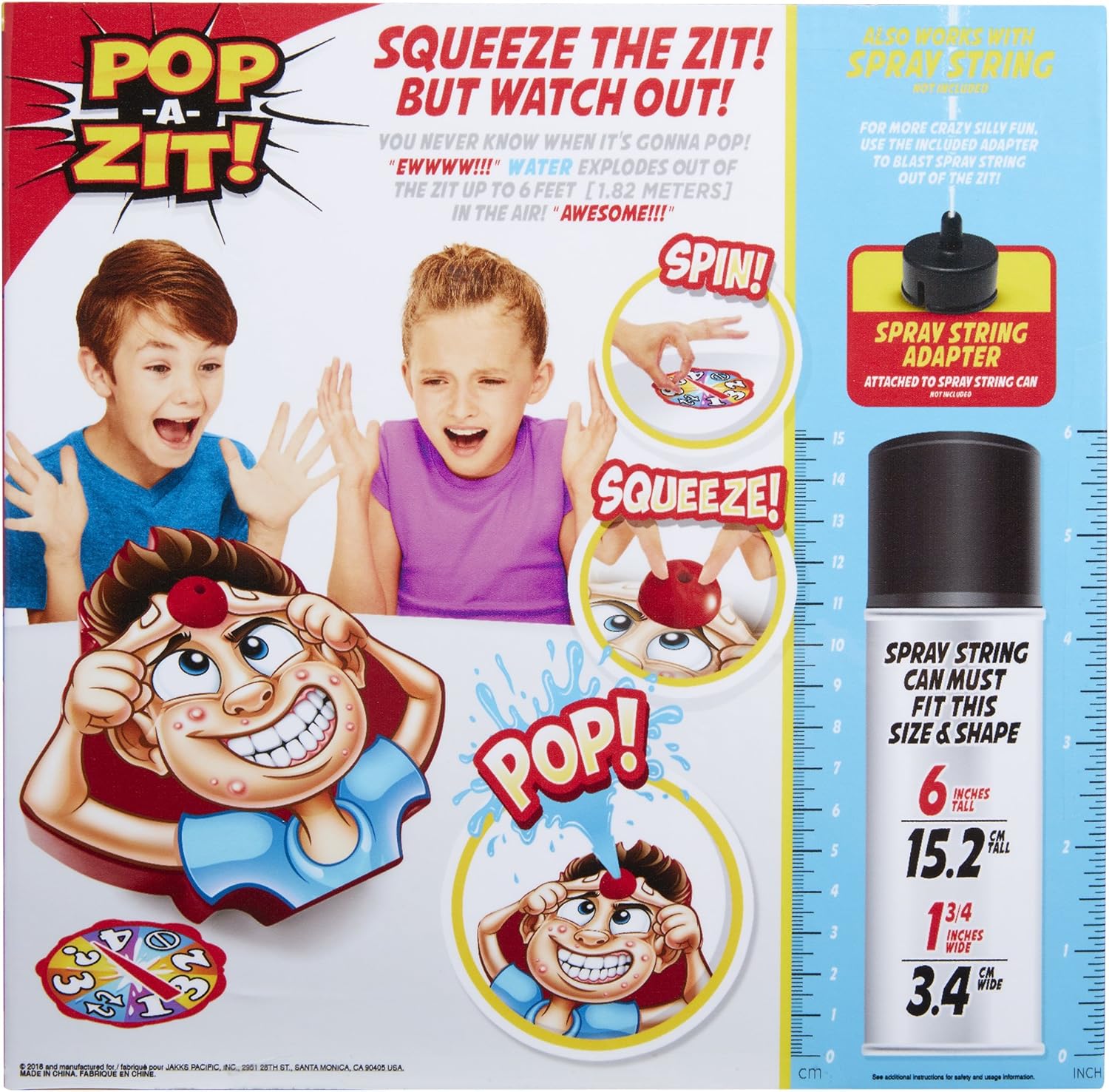 - Contents: 1 Pop A Zit game board, 1 water bottle, 1 spinner, 1 spray string adapter