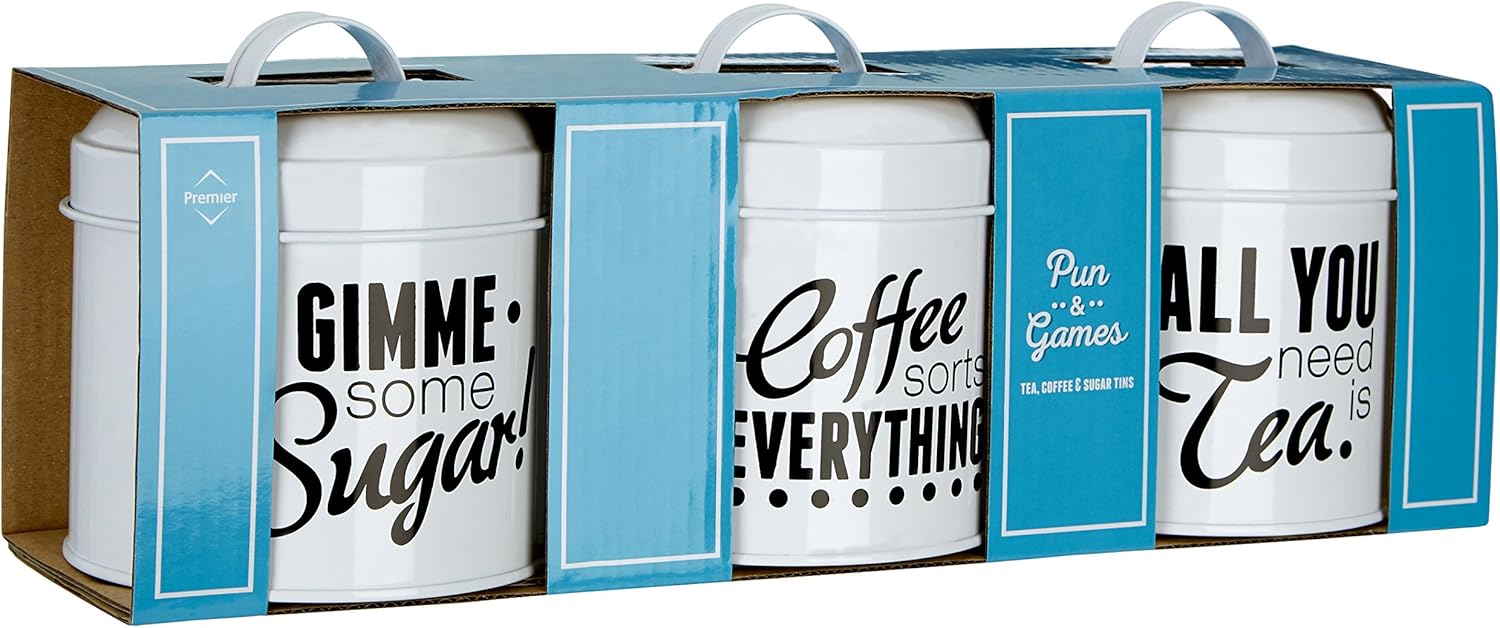 Premier Housewares Pun and Games Tea/Coffee/Sugar Canisters, White, Set of 3