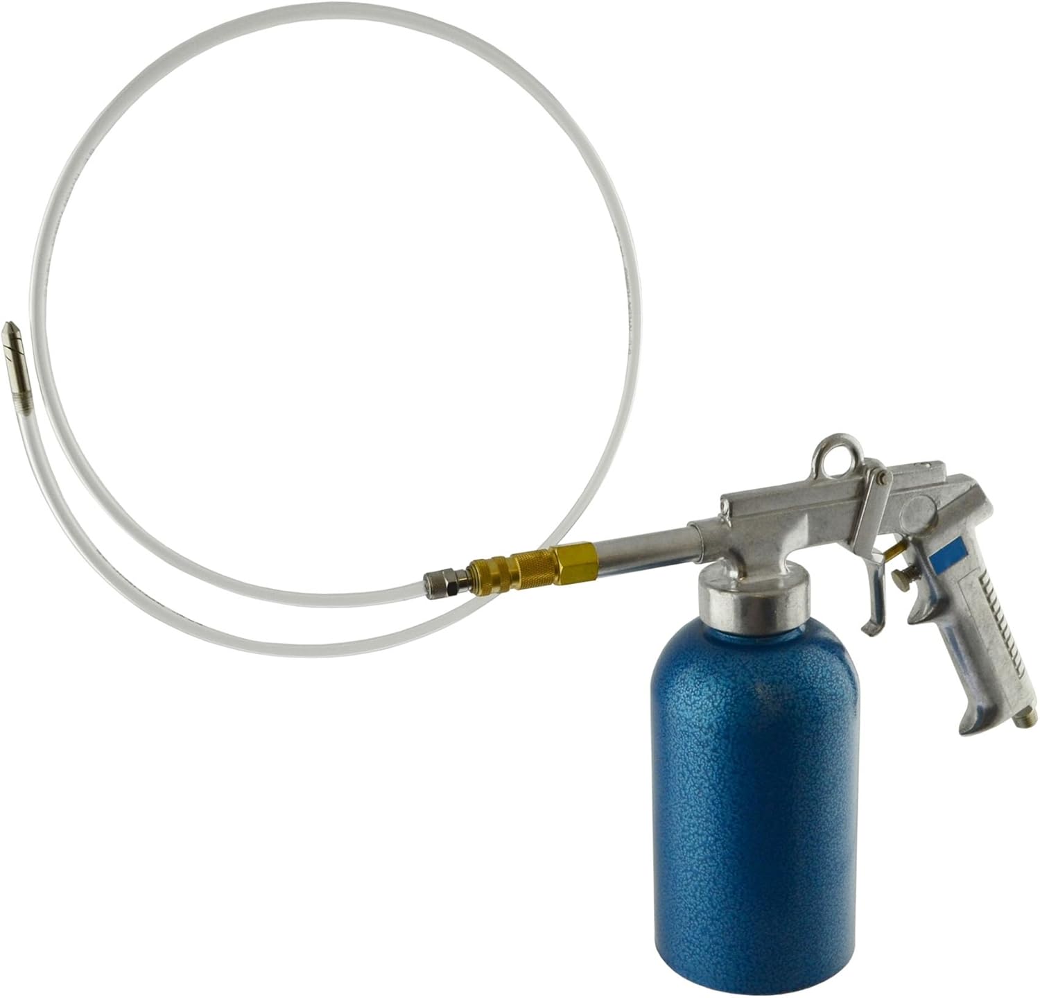 The pot is pressurised with high pressure air up to 80psi and this pressure forces the material up an out through the nozzle. Most underseal sprayers rely on blowing air across the top to suck up the material or use low pressure to spray the material and this makes them likely to clog on thicker mediums. With this gun the underseal is forced out at high pressure making it very unlikely to clog up.