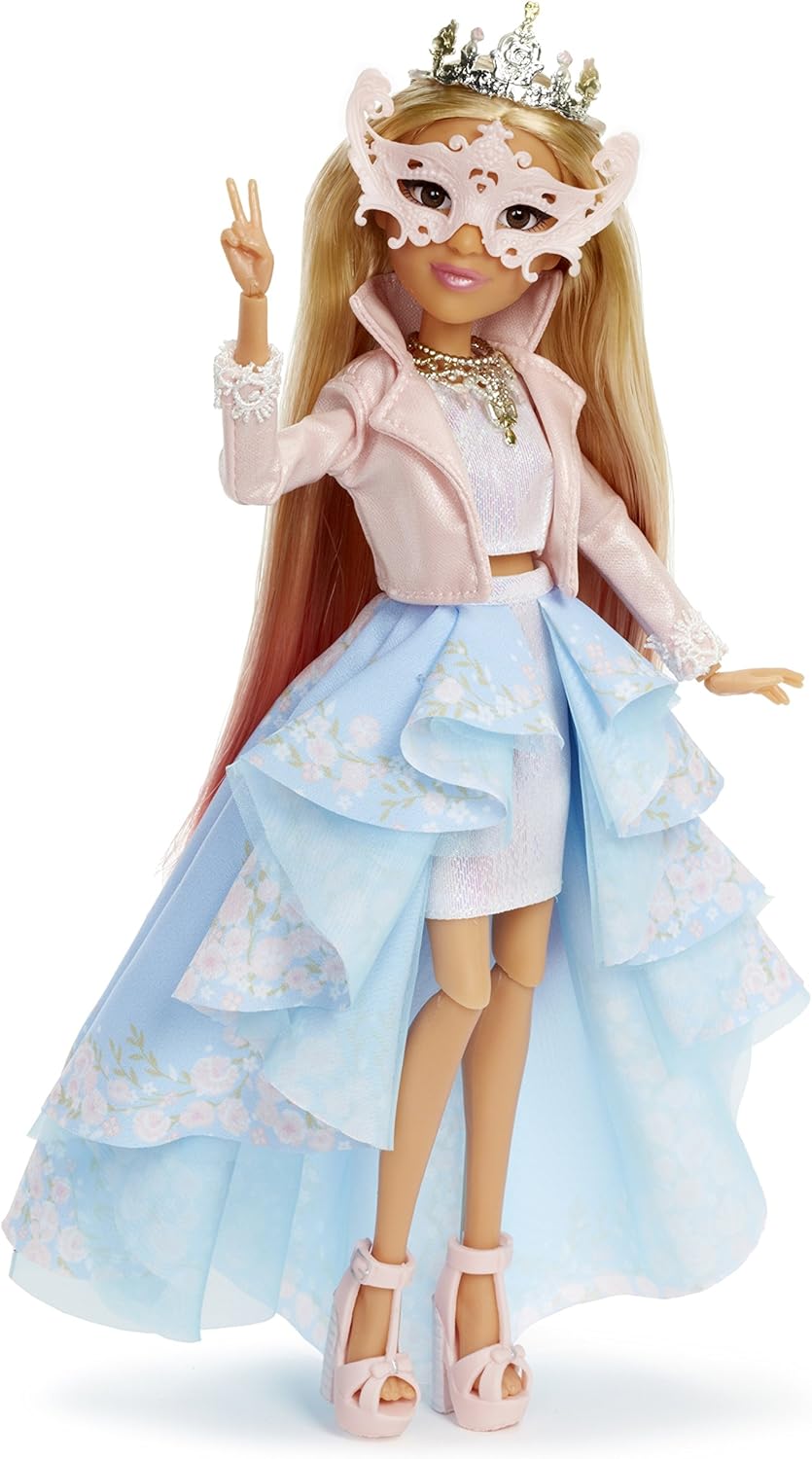 - Doll fashion accessories include: baby pink moto-style jacket with white lace cuffs, white iridescent skirt with blue floral georgette overlay with baby blue sheer organza lining, white iridescent sleeveless top, silver iridescent tiara, pearly pink masquerade mask, pearl encrusted cat eye glasses, silver princess necklace, platform t-strap sandals with glitter encrusted heel and comb to style your doll’s hair