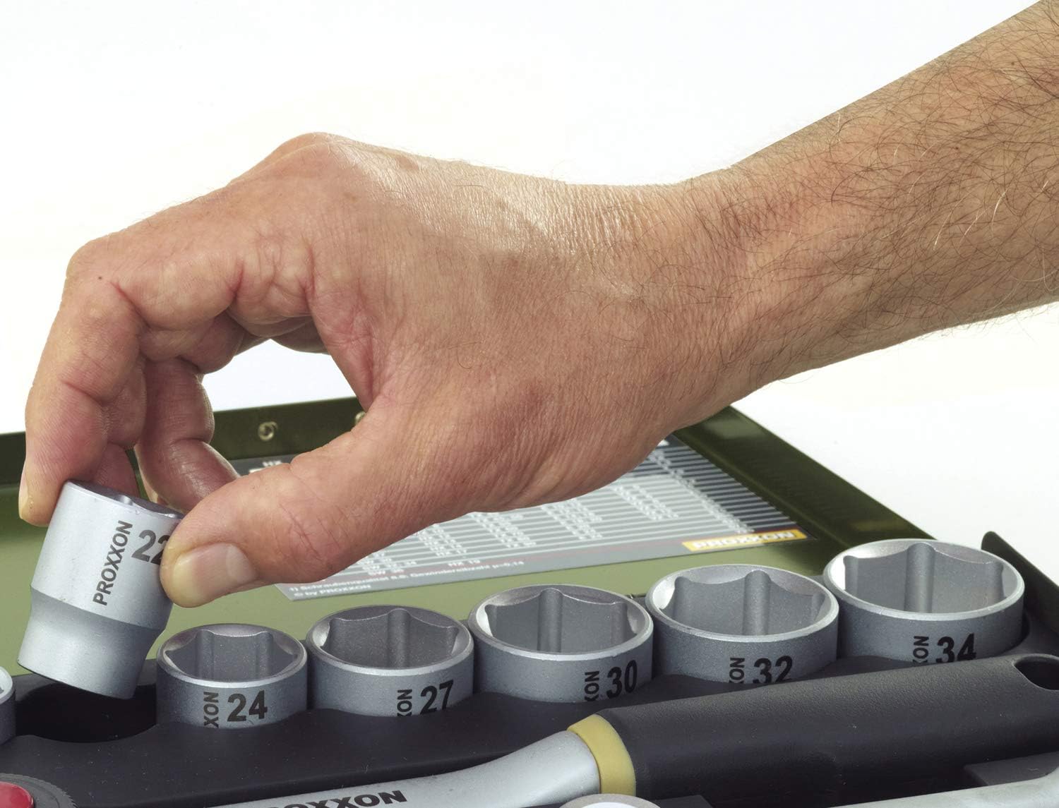 Proxxon 23080 precision engineer’s 36 piece 1/4 inch drive socket set includes 4 13 millimeter sockets, 12 each 1/4 inch drive screwdriver bit sockets for slotted, Phillips and Allen sockets and 1.25, 1.5, 2.0, 2.5 and 3 millimeter Allen keys. 1/4 inch drive ratchet is made from one single piece for strength; the head is not welded on. Quick release button releases socket instantly when pressed. Perfect teeth are suitably hardened for maximum life expectancy. Reliable drive direction mechanism simultaneously engages numerous teeth to ensure optimal torque transmission. Also includes 1.75 inch extension, 3 inch sliding “T” extension and 1/4 inch universal joint. Proxxon sockets and attachments are made from the highest quality steels and exceed DIN/ISO requirements for hardness and maximum torque. Screwdriver tips are made from chrome-silicon manganese-molybdenum steel. Sockets and attachments are made from high carbon 31 CrV steel. Double nickel plating and single chrome plated finish provide optimum surface protection on all sockets and attachments. The set comes in a welded steel box that is powder coated for durabiity with a strong molded plastic insert which provides a secure location for each item.
