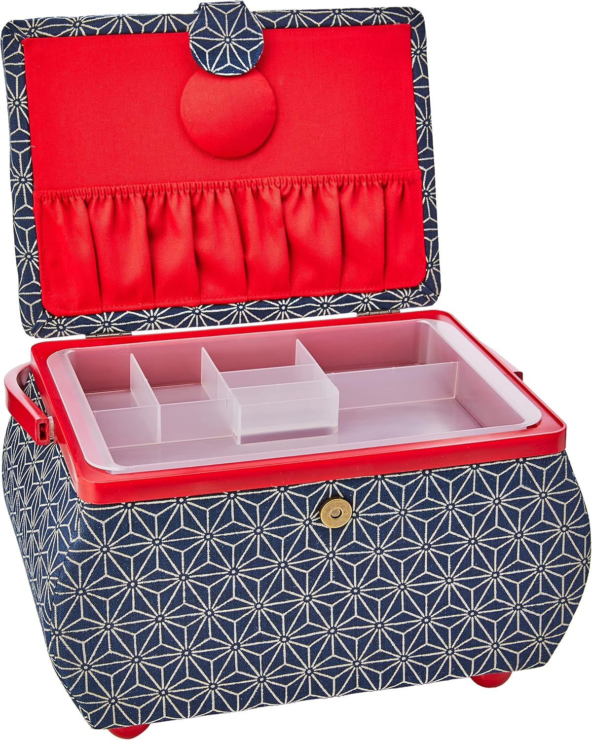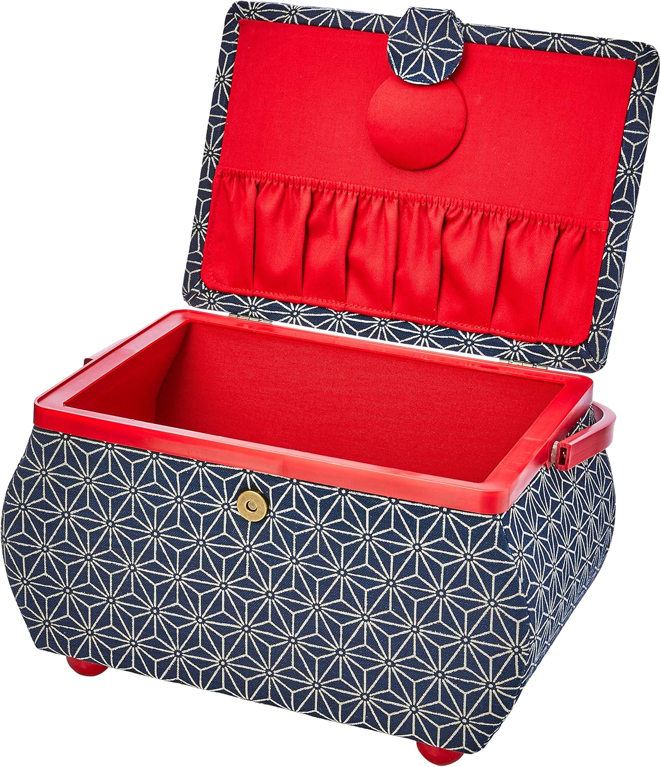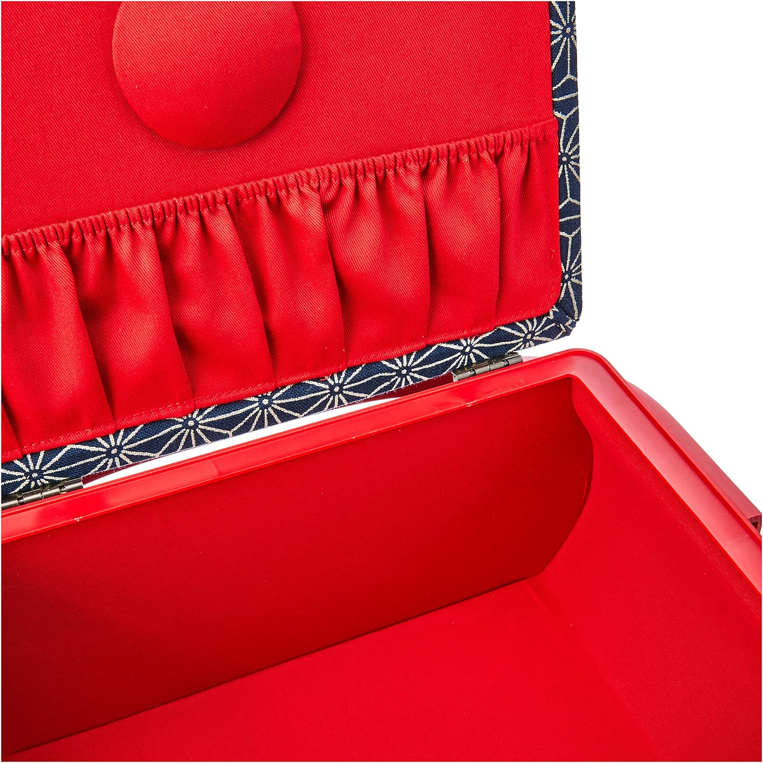 You will not pass by the original look of the large, bulbous Kyoto sewing basket. The navy blue cotton cover with its modern, geometric design makes a marked contrast with the handle and the sides in eye-catching red. The interior of the sewing basket also promises a lot: The generous red interior reveals plenty of room for storing your sewing things and its removable plastic insert with seven practical compartments provides sufficient storage space for small haberdashery items, such as thimbles or spools of thread. Inside the lid there are a pin cushion and two fabric pockets for additional accessories, such as measuring tapes, pens and much more. All in all, if you value elegant design, you will not pass by this little jewel.