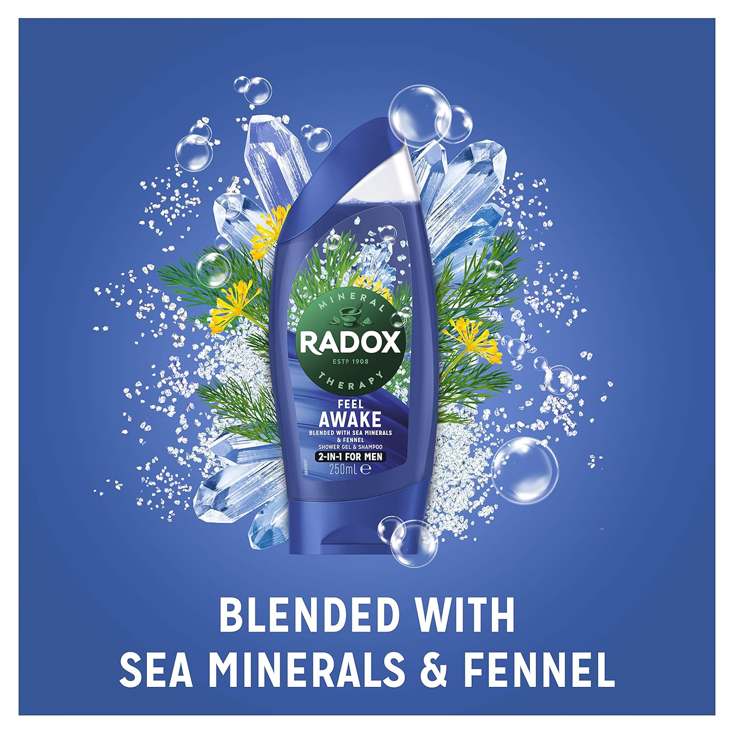 Radox feel awake 2-in-1 men’s shower gel is shower gel with mood changing fragrance of fennel and sea minerals. This refreshing shower gel leaves your skin delightfully fragrant which makes you feel awake. when using Radox 2-in-1 shower gel and men’s body wash, For results in shower, squeeze out shower gel, lather on body. body wash rinses off easily leaving your skin feeling fresh and clean. A men’s shower gel suitable for daily use. Avoid eye contact. If eye contact occurs rinse well with warm water. If rash or irritation occurs, discontinue use. Radox have been taking inspiration from natures fragrances since 1908 to create refreshing shower gels. Radox then capture their transformative effects with one goal in mind: to help people get in the mood they want to be in. Smell is not only one of the most important senses, but one of the most overlooked. Fragrance has the power to lift you when you’re down, to awaken you when you rise, to make us sleep, love, create, dream. It has the power to genuinely transform how you feel. In fact, there’s hardly a mood in society that cannot be moved by fragrance and there’s barely a person on earth who cant be affected by the right scent. shower gels with nature inspired fragrance to transform your mood.