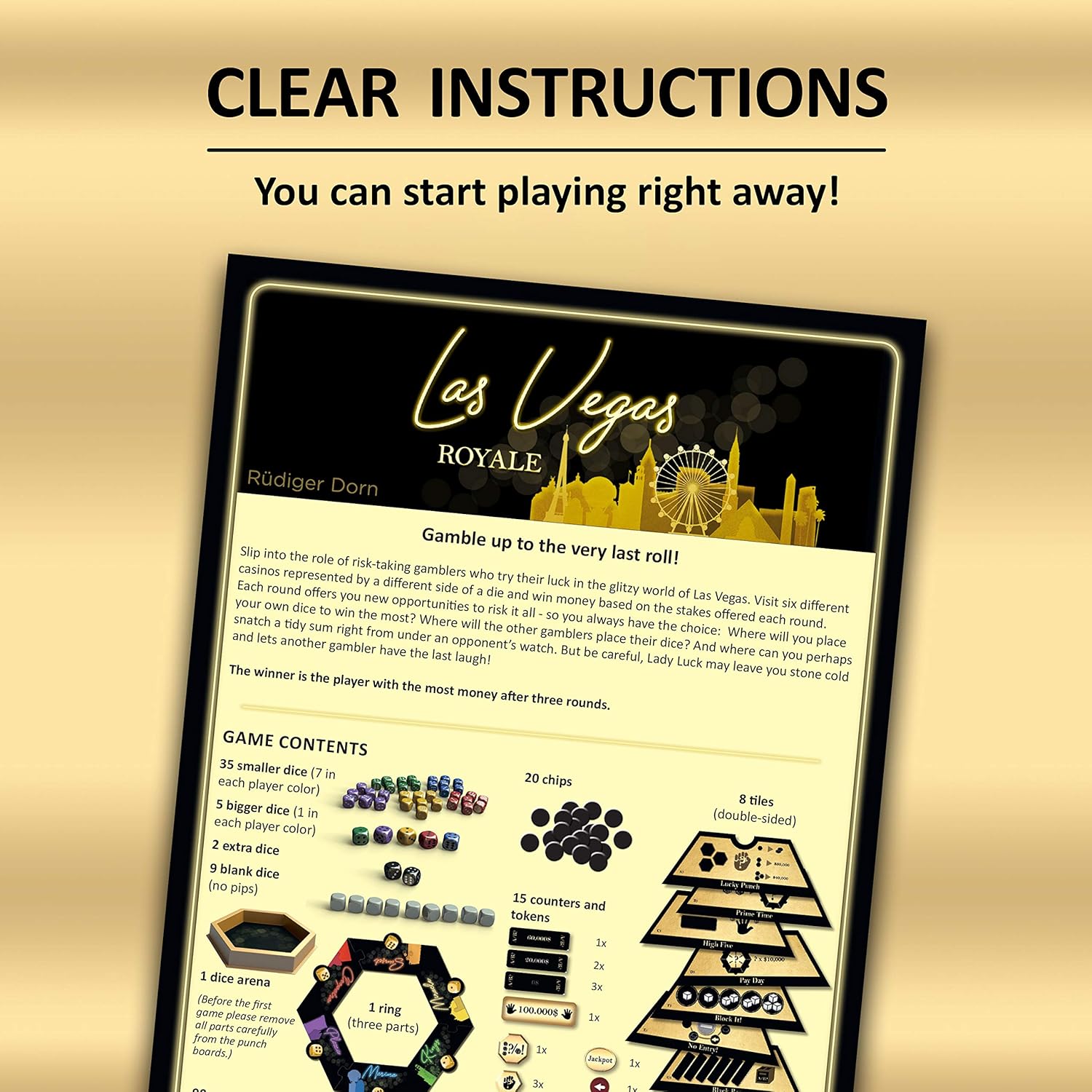 - Great replay value – 45-60 minute play time, for 2-5 player, LAS Vegas royale’s innovative game play is easy-to-learn with varying levels of difficulty and the 12 new casinos require different strategies and tactics which creates a different experience Each time you play.