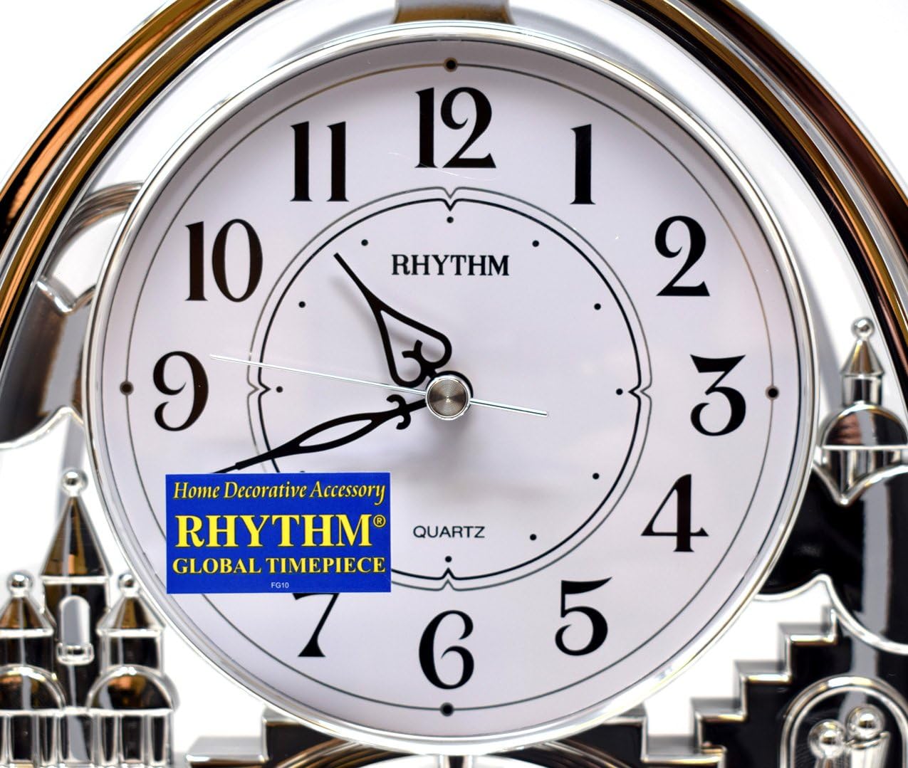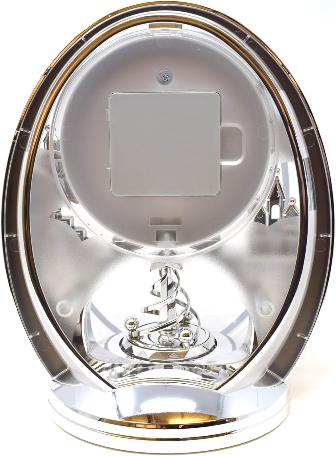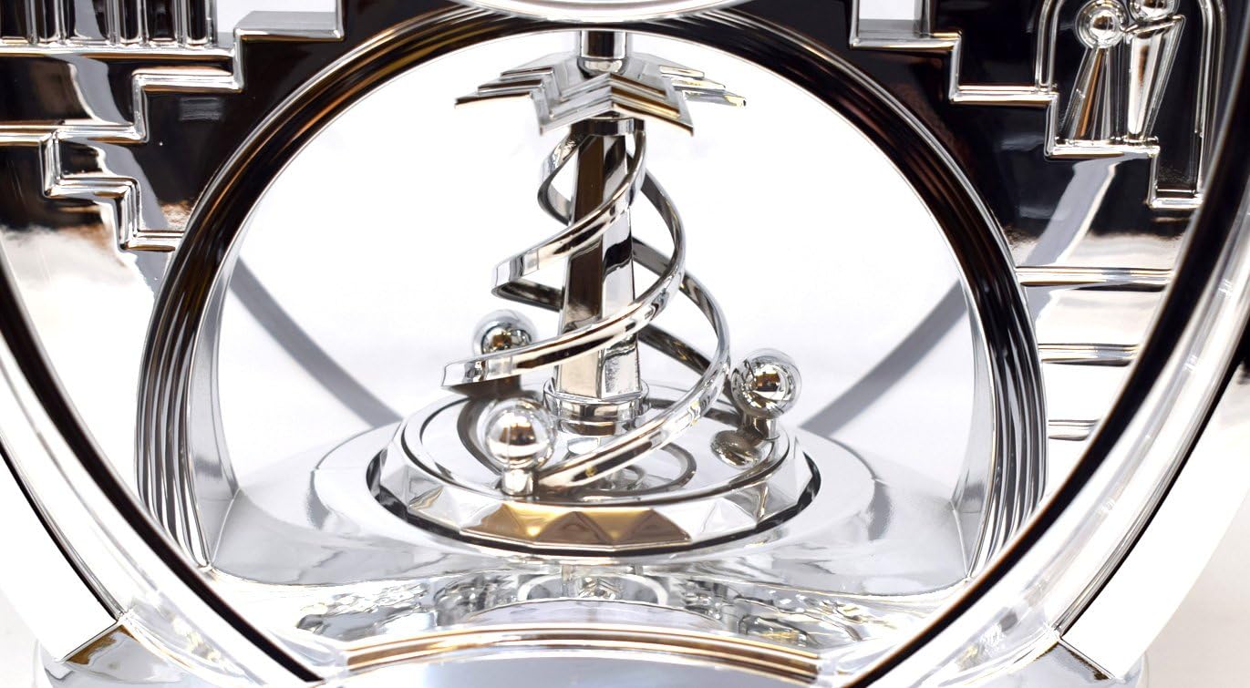 |Rhythm mantel clock from the Contemporary Mantel Clocks range.;Silver/chrome colour. Rotating spiral pendulum.;Made from premium plastic components. Ideal for your home or office. A lovely special timepiece, looks great when working on display.;Contemporary modern design. Easy to read Arabic clock face dial.;26cm (10) x 19cm (7½) x 13cm (5). Battery: 2 x AA included.|