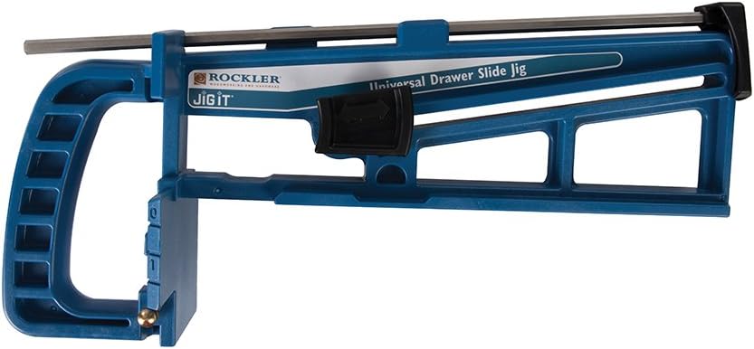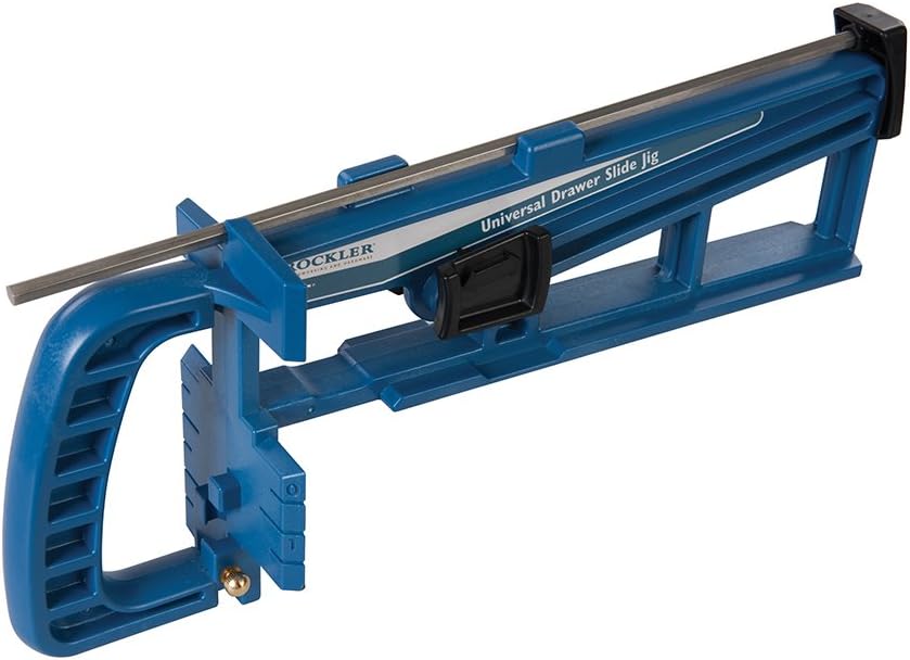 Strong, plastic door slide Jig allows drawer slides to be installed quickly, accurately and easily. Sliding wedge locks slide securely into the Jig. Adjustable indexing foot allows perfect repeatability. Foot can be rotated for use on top or bottom. Cut-outs in Jig allow access for drill and driver bits.