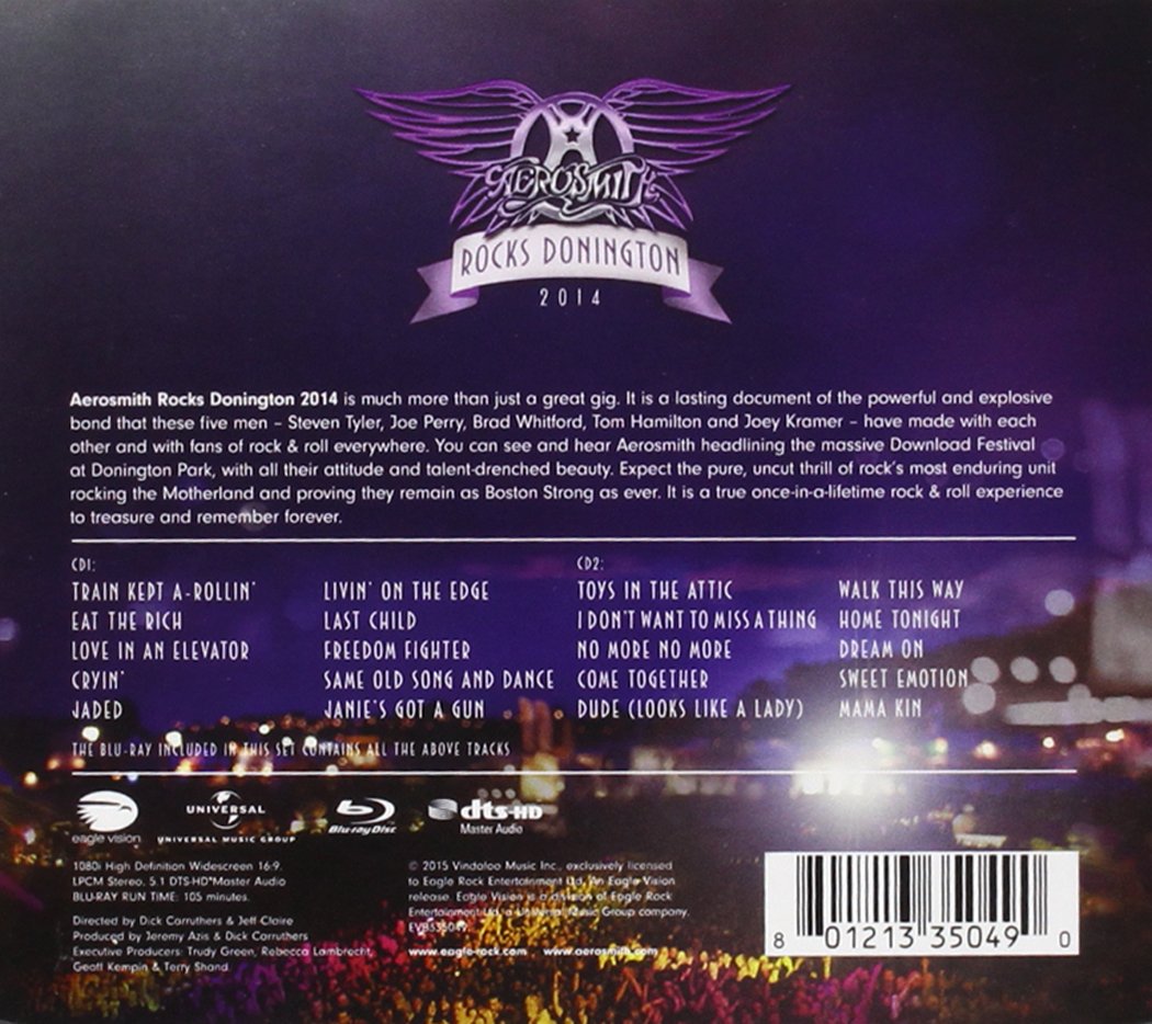 Aerosmith Rocks Donington 2014 is much more than just a great gig. It is a lasting document of the powerful and explosive bond that these five men Steven Tyler, Joe Perry, Brad Whitford, Tom Hamilton and Joey Kramer have made with each other and with fans of rock ‘n’ roll everywhere. The film captures Aerosmith headlining the massive Download Festival at Donington Park with all their attitude and talent-drenched beauty as they deliver a blistering set of their greatest hits. It is a true once-in-a-lifetime rock ‘n’ roll experience to treasure and remember forever.