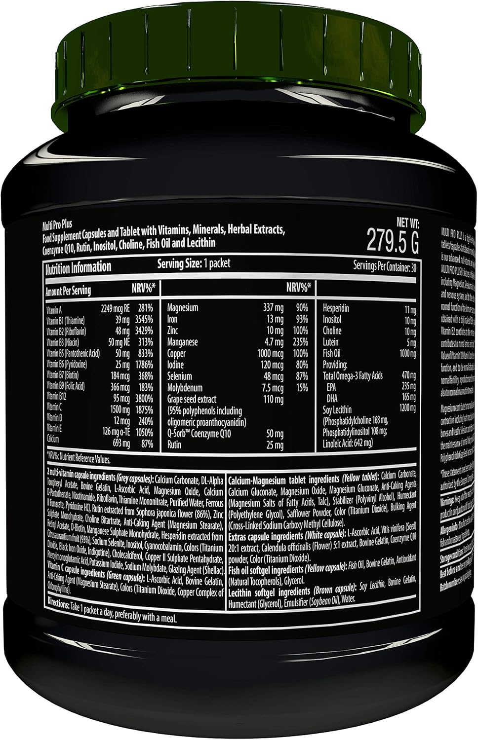MULTI PRO PLUS is a high-level multi-vitamin and mineral formula in a packet of several tablets/capsules that’s based on our 2013 MEGA DAILY ONE PLUS multi-vitamin caps. MEGA DAILY ONE PLUS is our advanced multi-vitamin and mineral formula that has 25 ingredients itself (plus the extras of MULTI PRO PLUS)! It features a high-dose Vitamin B complex and Vitamin C, plus essential minerals including Magnesium, Selenium and Zinc. Vitamin C contributes to the normal function of the immune and nervous systems, and to the reduction of tiredness and fatigue. It also helps to maintain the normal function of the immune system during and after intense exercise (the bene cial e ect is obtained with a daily intake of 200 mg in addition to the recommended daily intake of Vitamin C)! Vitamin B2 contributes to the maintenance of normal vision and normal red blood cells. Folate contributes to normal amino acid synthesis. MULTI PRO PLUS has 250% of the Recommended Daily Allowance of Vitamin D3! Vitamin D contributes to the maintenance of normal muscle and immune system function, and to the normal absorption/utilisation of calcium and phosphorus. Zinc contributes to normal fertility, reproduction and to the maintenance of normal testosterone levels, and also to normal macronutrient metabolism. Magnesium contributes to normal functioning of the nervous system: neurotransmission and muscle contraction including heart muscle; also to normal protein synthesis and to the maintenance of normal bones and teeth. | Selenium contributes to normal spermatogenesis, to normal thyroid function and to the maintenance of normal hair, nails. MULTI PRO PLUS additionally has an Omega-3 and Lecithin softgel, Co Q10, Polyphenol rich Grape Seed extract and it’s forti ed with Lutein as well!