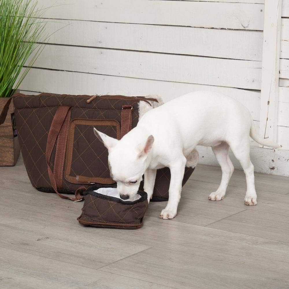Featuring a quilted outer fabric, stitched in a diamond pattern. A luxurious plush fur is used for the lining, providing warmth and comfort. The Wilton carrier is available in three colors, complete with fold-out water bowl and adjustable straps.