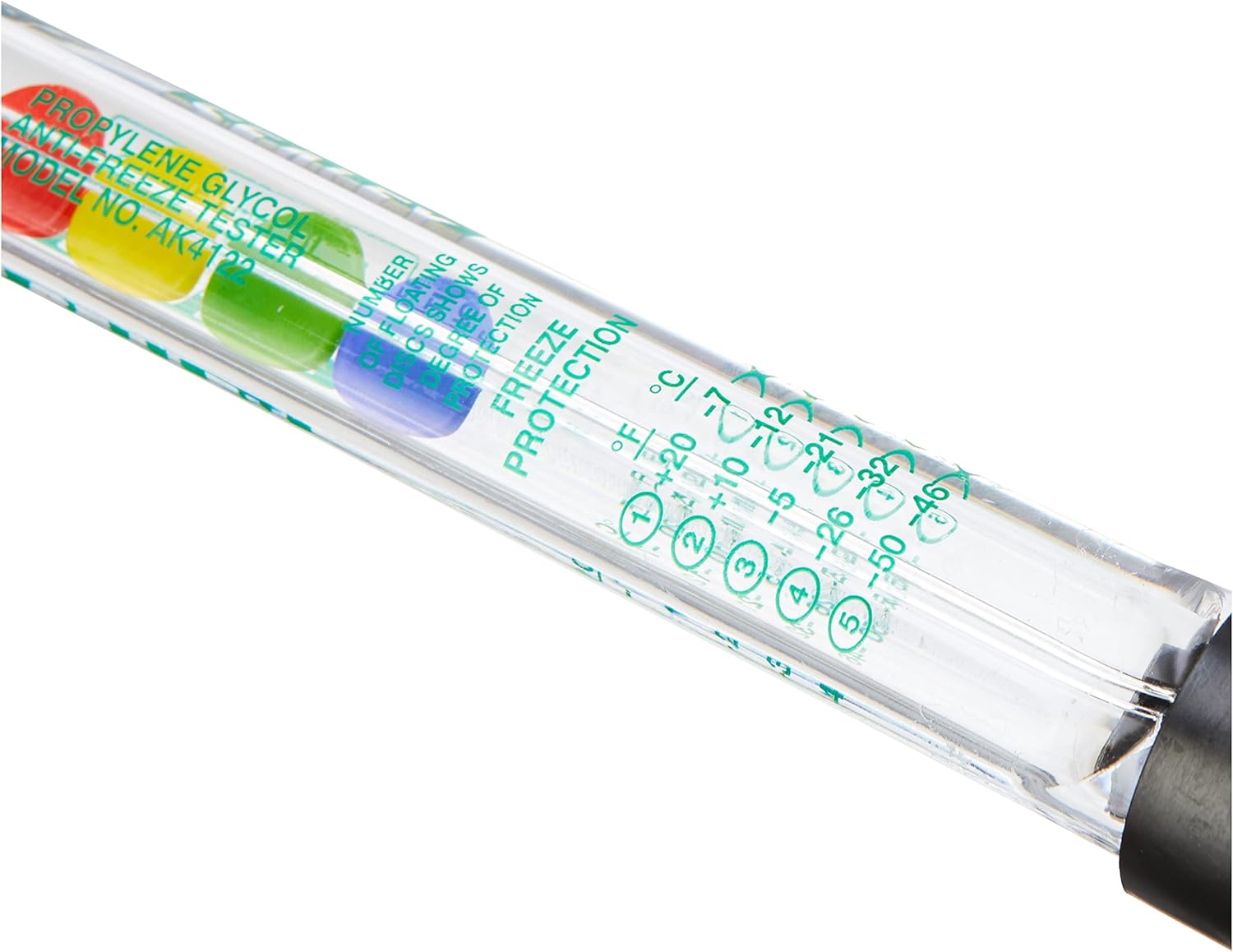 Tests modern propylene glycol coolant antifreeze, hot or cold. Protection level is indicated by the number of discs floating in the sample. Easy-to-read temperature table. Tough, virtually unbreakable, plastic body. Model No. AK4122