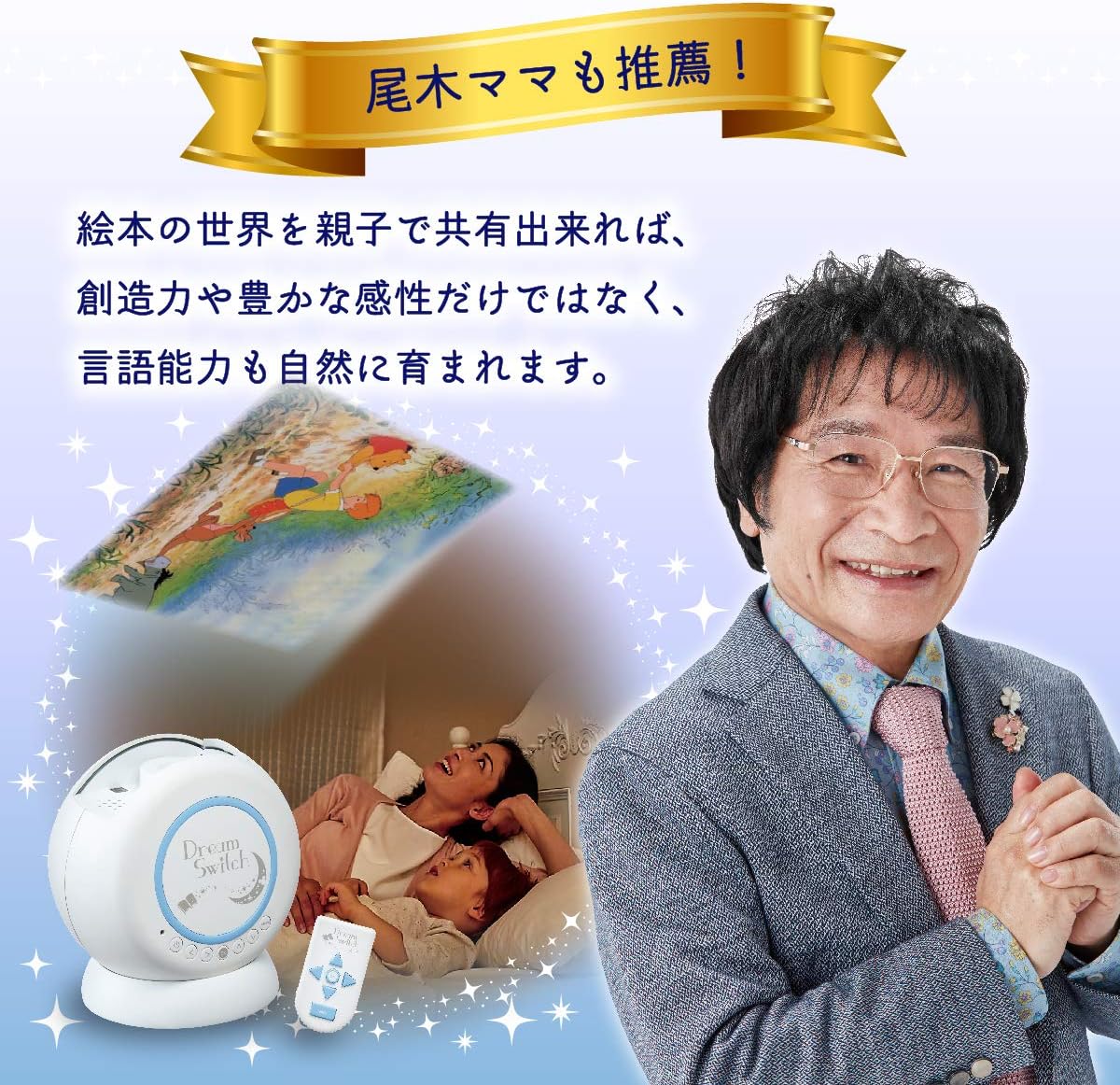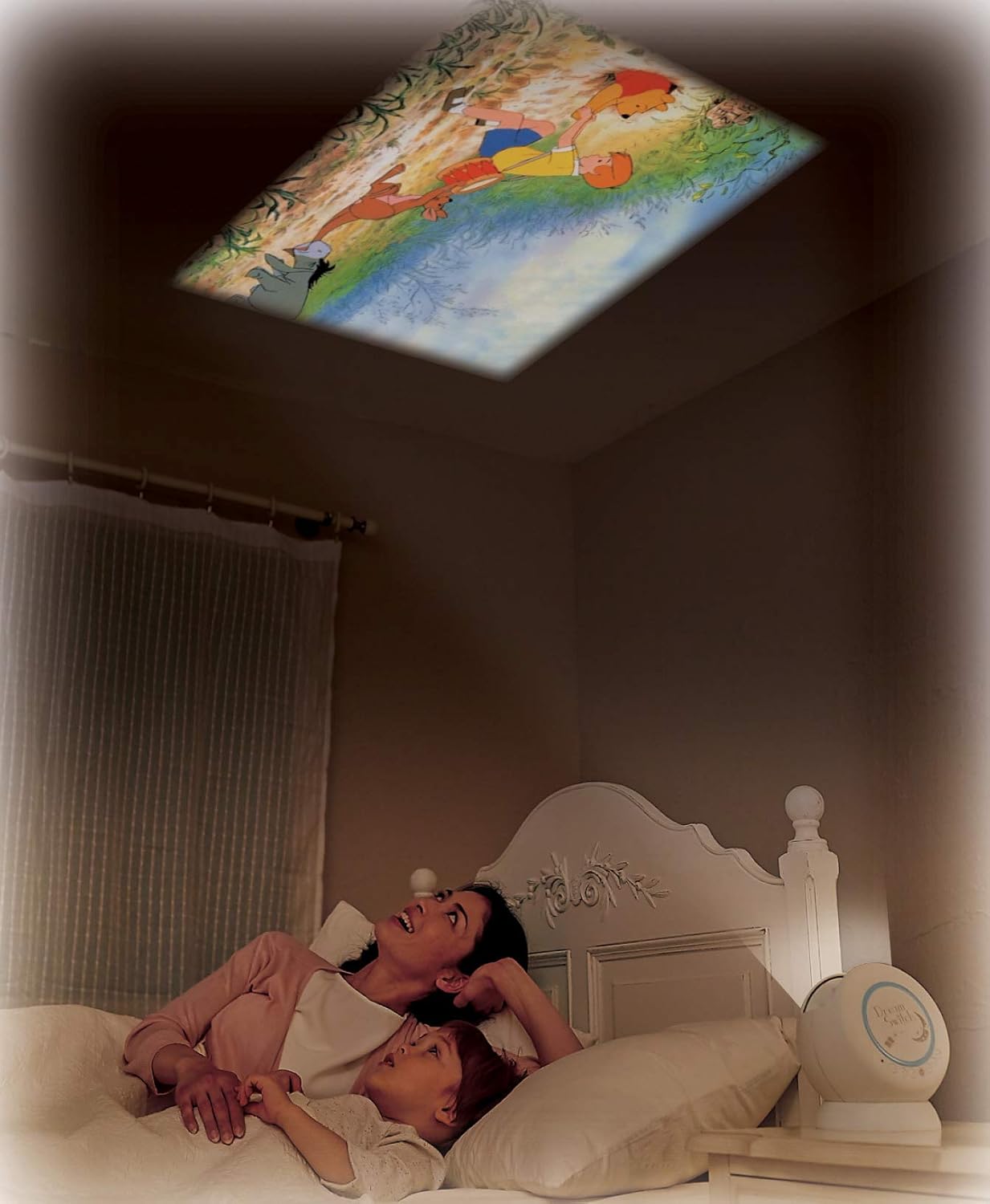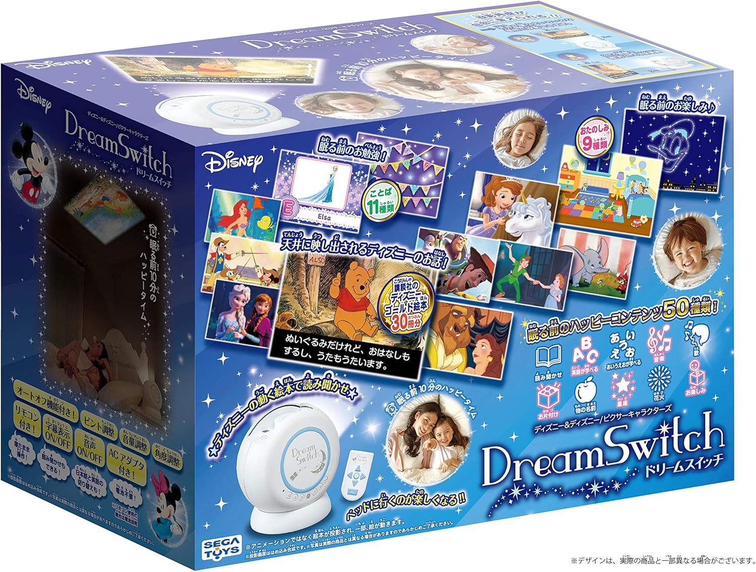A picture book projector that projects the story of Disney on the ceiling of the bedroom, which makes it fun before the parents and children sleep. The story is selected from 50 kinds of contents, the story of about 10 minutes starts, and disappears by the auto off when the story is over.