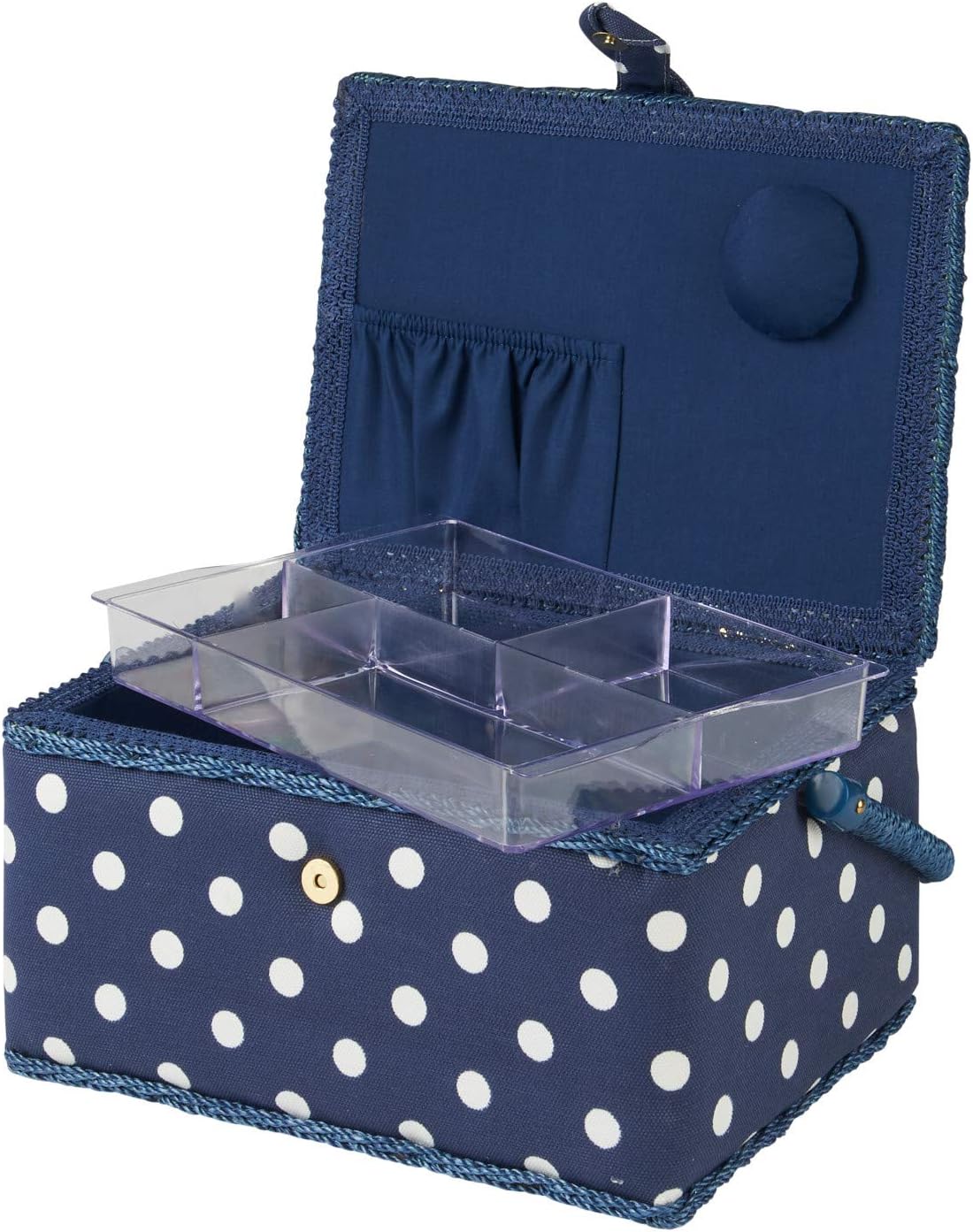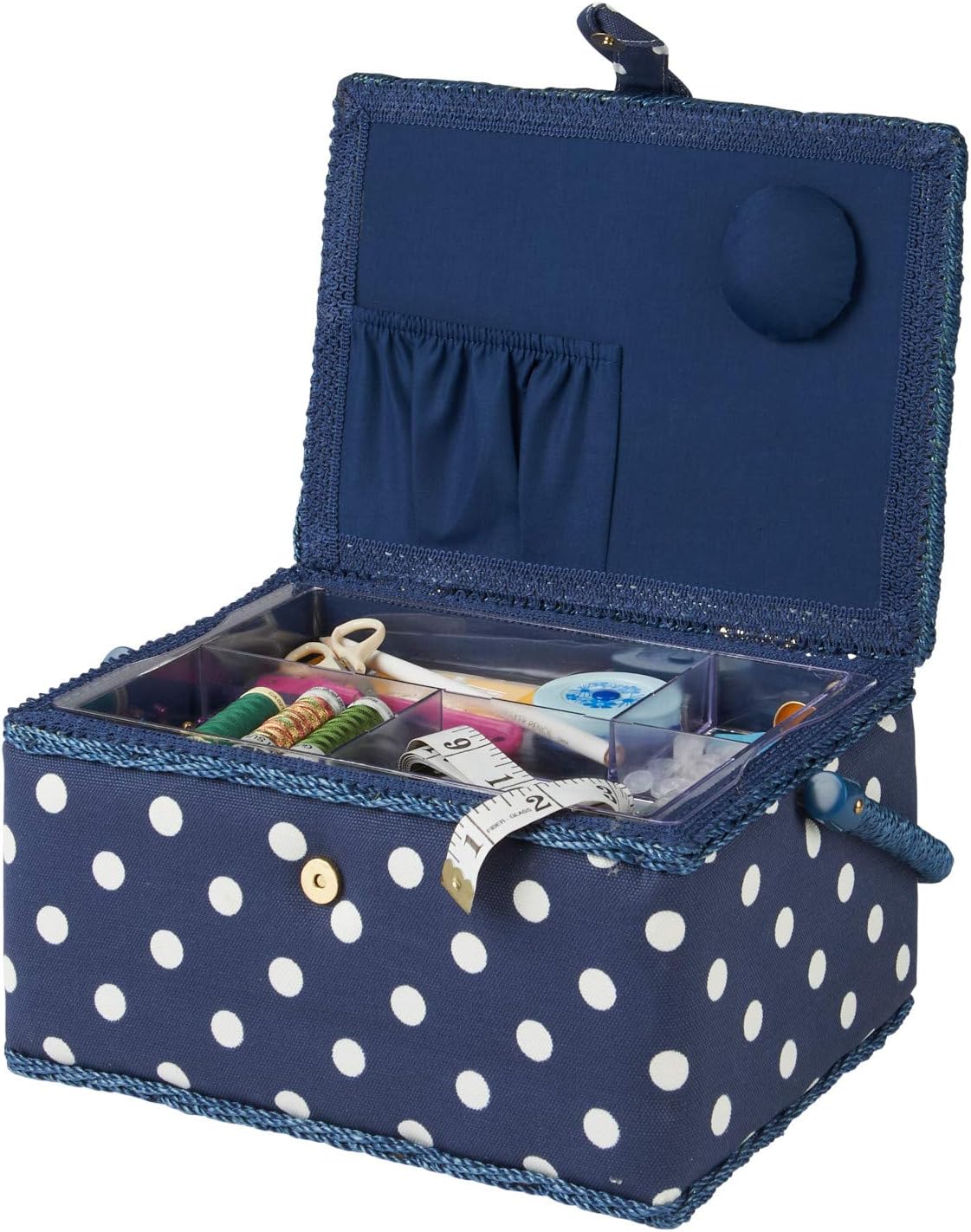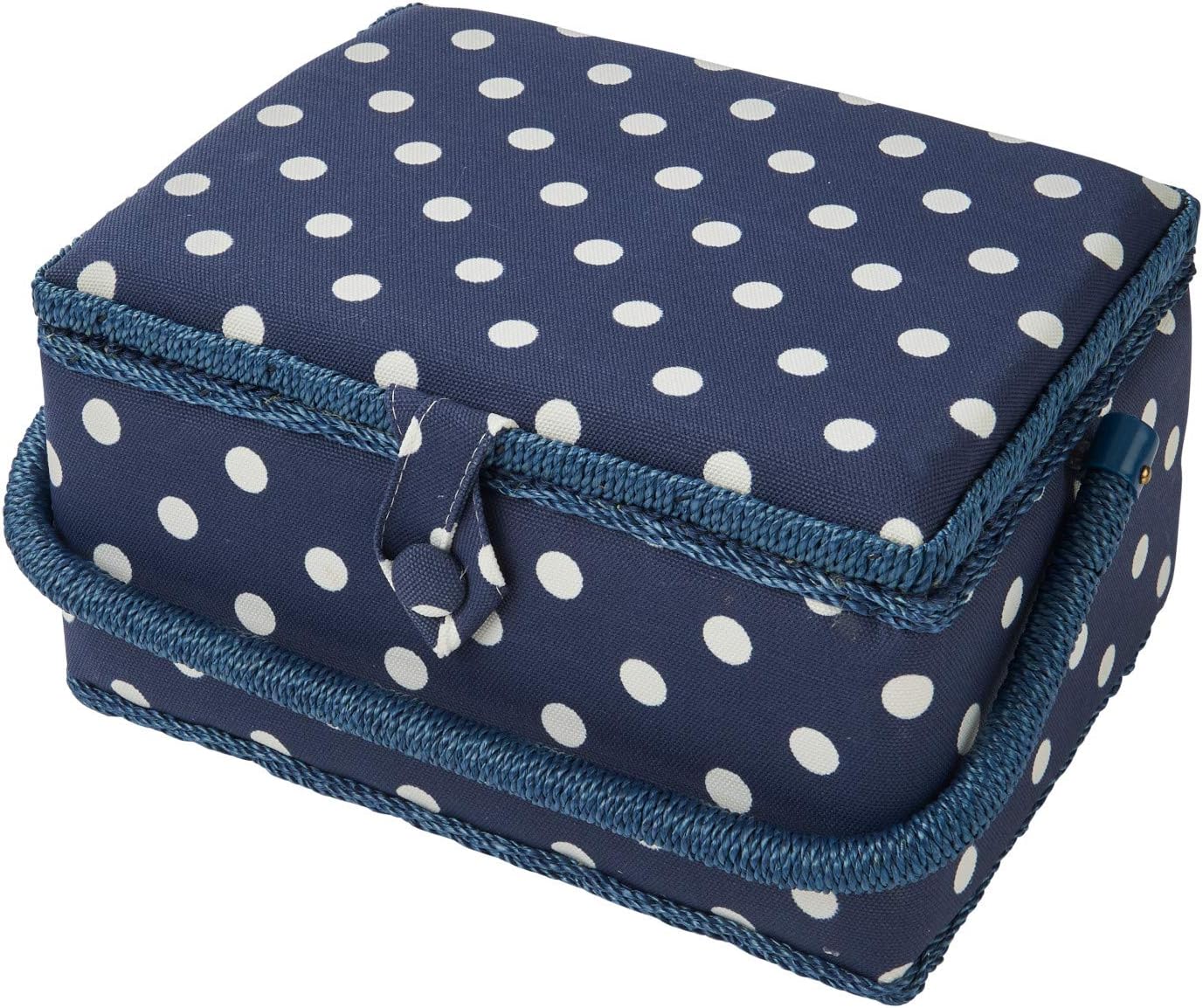 This medium sized sewing box is covered with a Navy Polka Dot Cotton Fabric The Sewing box is padded so it feels soft to touch on the lid and sides. The box is kept closed with a velcro catch. The handle is strong and sturdy for easy transportation tucking out of the way to the front or back of the box when in use. The box is made from hardboard that is completely covered both inside and out. Inside the basket the covering compliments the outside fabric colour. The lid has a small pincushion and useful pocket for storing smaller items. Included with the box is a removable plastic tray to hold anything from scissors to pins and your smaller items. This is a well designed functional medium sized sewing box that would make a great personal treat or exciting present.