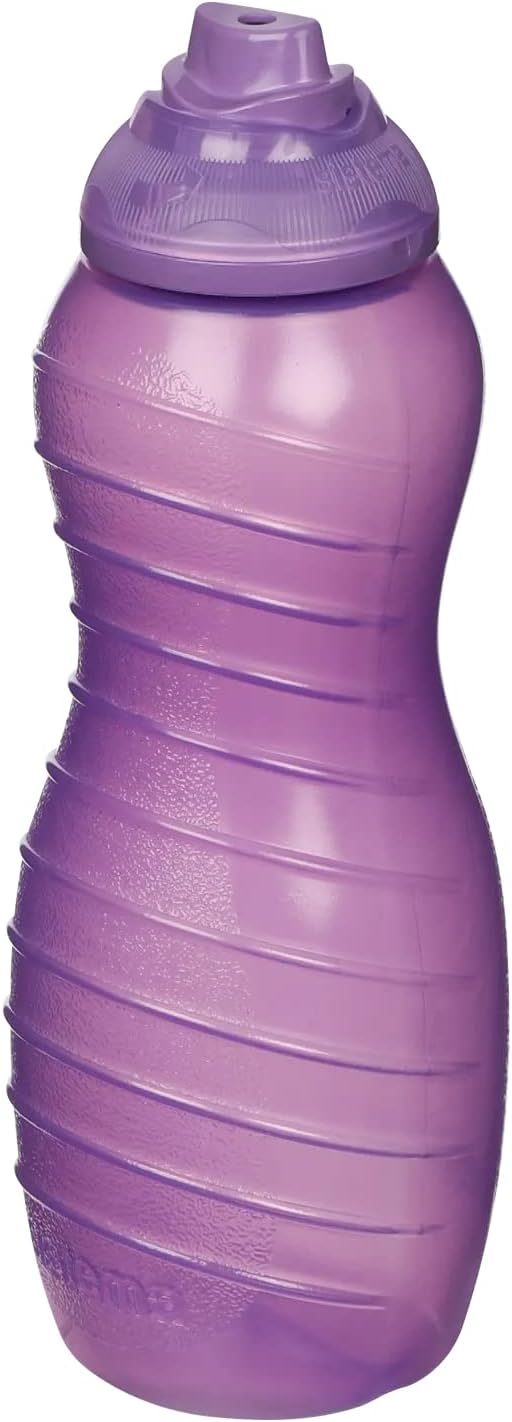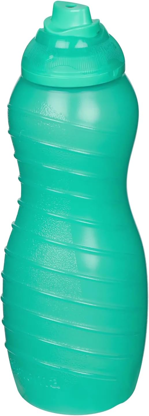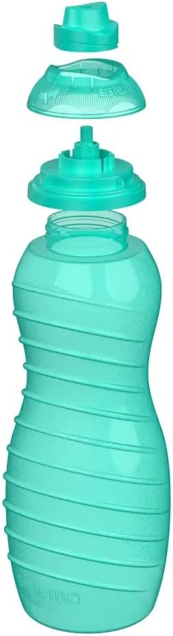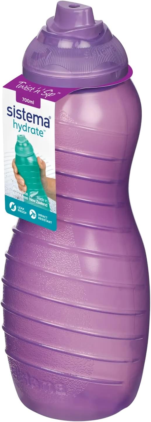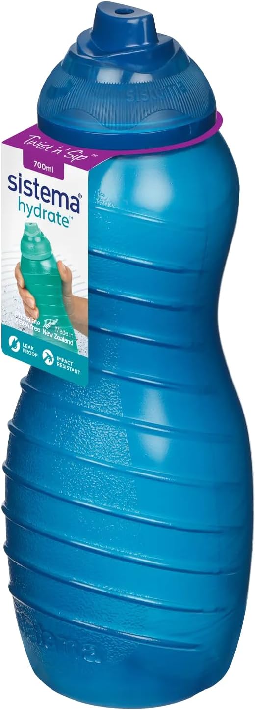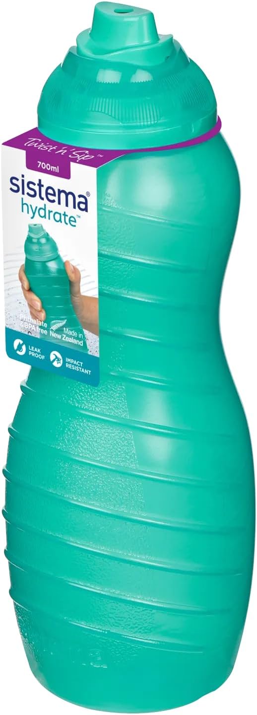 Three larger capacity 700 ml drinks bottles with a twist top mechanism for drinking and sealing the bottle. Twist the collar to open the drinking hole and simply twist the other way to seal again. Leak proof design. Side grooves make these bottles easier to hold. Perfect for school, work, picnics or drinking on the go. Made from low density polyethylene. BPA Free. Made from Lead Free Virgin Materials. Capacity 700ml. Height: 22.3cm, Width: 8.3cm, Depth: 8.3cm. Please note trim colour may vary from photo