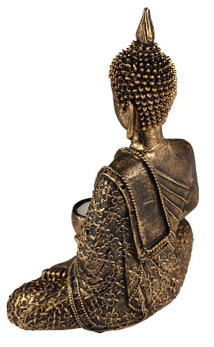 Tall Thai Buddha Gold Bronze Tea Light Holder Figurine Ornament. In a praying / meditation position. Holds a tea light candle, cupped in their hands. Beautiful, eye catching ornament. Stunning in a low lit room in the evening, for a tranquil effect. Full sizes; 27 cm tall x 15 cm wide.