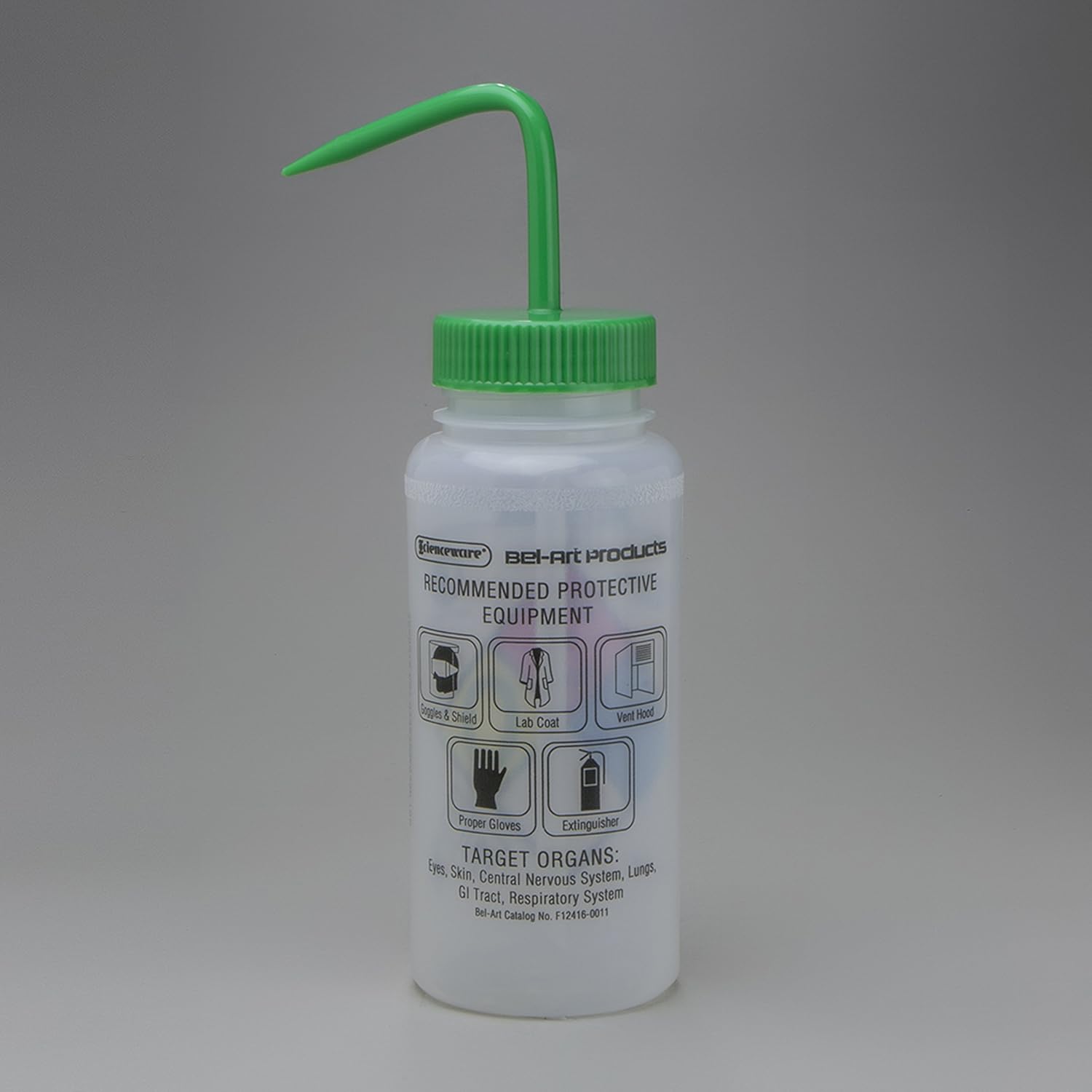 SP Bel-Art GHS Labeled Safety-Vented Methanol Wash Bottles; 500ml (16oz), Polyethylene w/Green Polypropylene Cap (Pack of 4) (F12416-0011)
