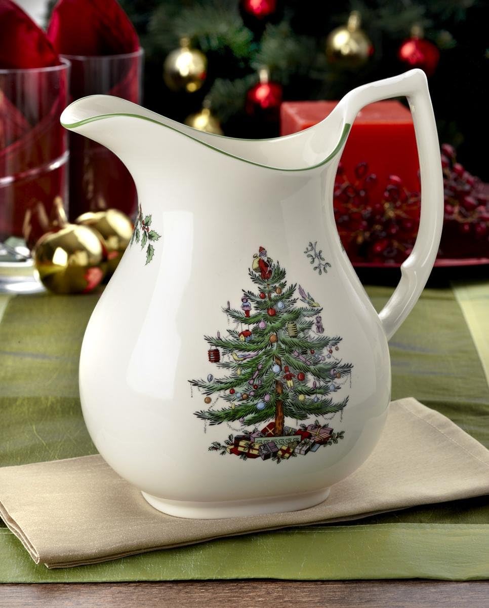 Spode Christmas Tree has graced table’s all over the world since 1938. The pattern has become a family tradition and feature’s a traditional christmas tree design. Each year this beautifully classic pattern heralds the beginning of a season of family and friends gathering, and seasonal entertaining. Introduced in 2010, this beautiful pitcher holds 49 oz. of your favorite holiday beverage. This piece can also hold a bouquest of your favorite holiday flowers to grace your table.