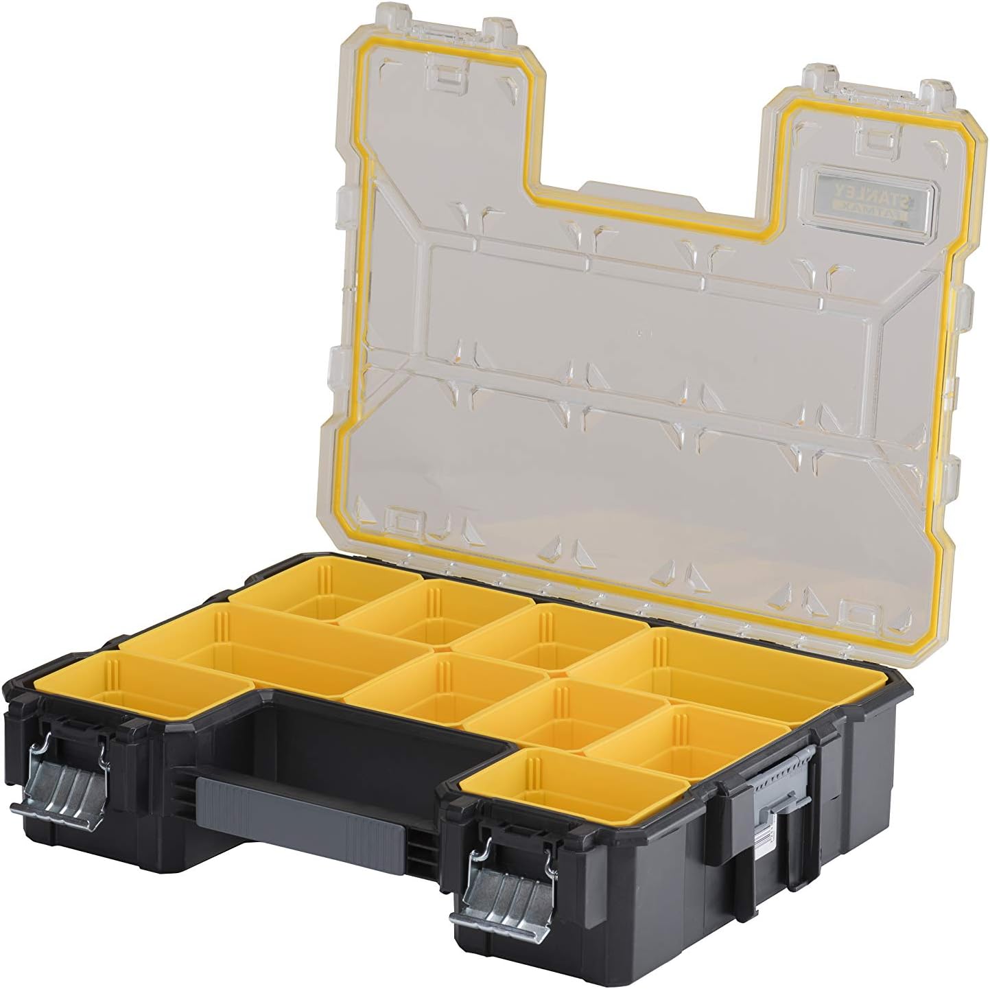 The Stanley 197518 FatMax Deep Professional Organiser has 10 removable storage compartments, providing storage for small parts, components or accessories, which can also be stacked together for use outside the organiser. Made from polypropylene, the organiser has a virtually unbreakable lid allowing the contents to be viewed easily and features a waterproof seal that not only prevents water, but also rust and foreign particles from entering. A plastic handle with textured grip allows the organiser to be moved comfortably, while the organiser’s lid has been specially designed to ensure that the compartments are held securely in place and fastens with two metal latches. For added versatility, multiple organisers can be clipped together using the side latches for easy transportation. Weight 2kg. FatMax Deep Professional Organiser