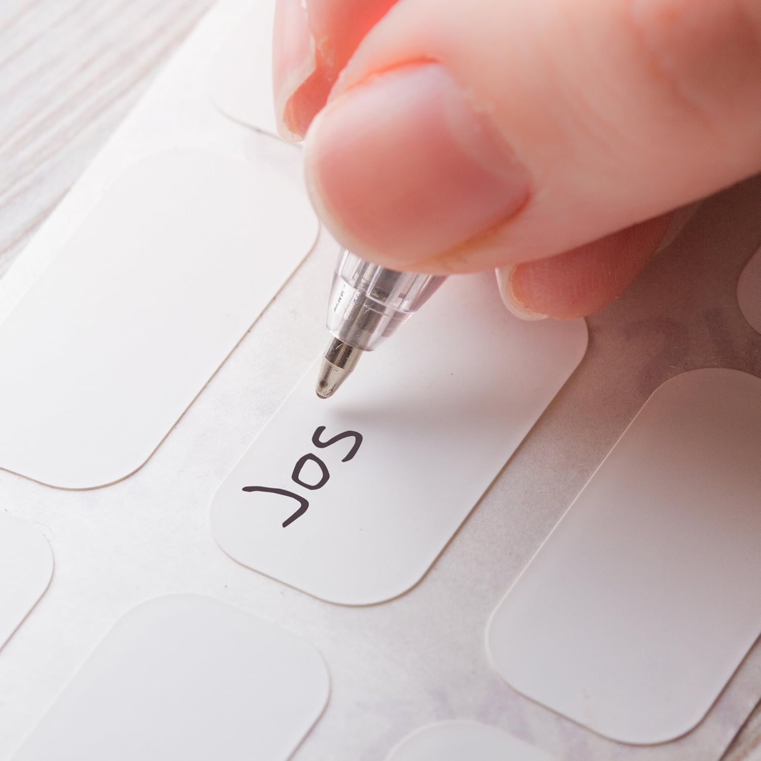 – Place a STIKINS label sheet onto a hard, flat surface. Write your required text onto the label using the special pen provided.