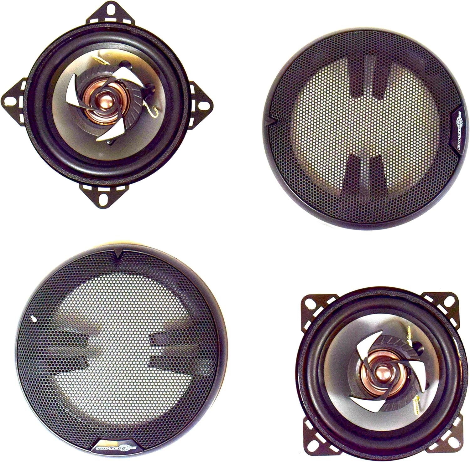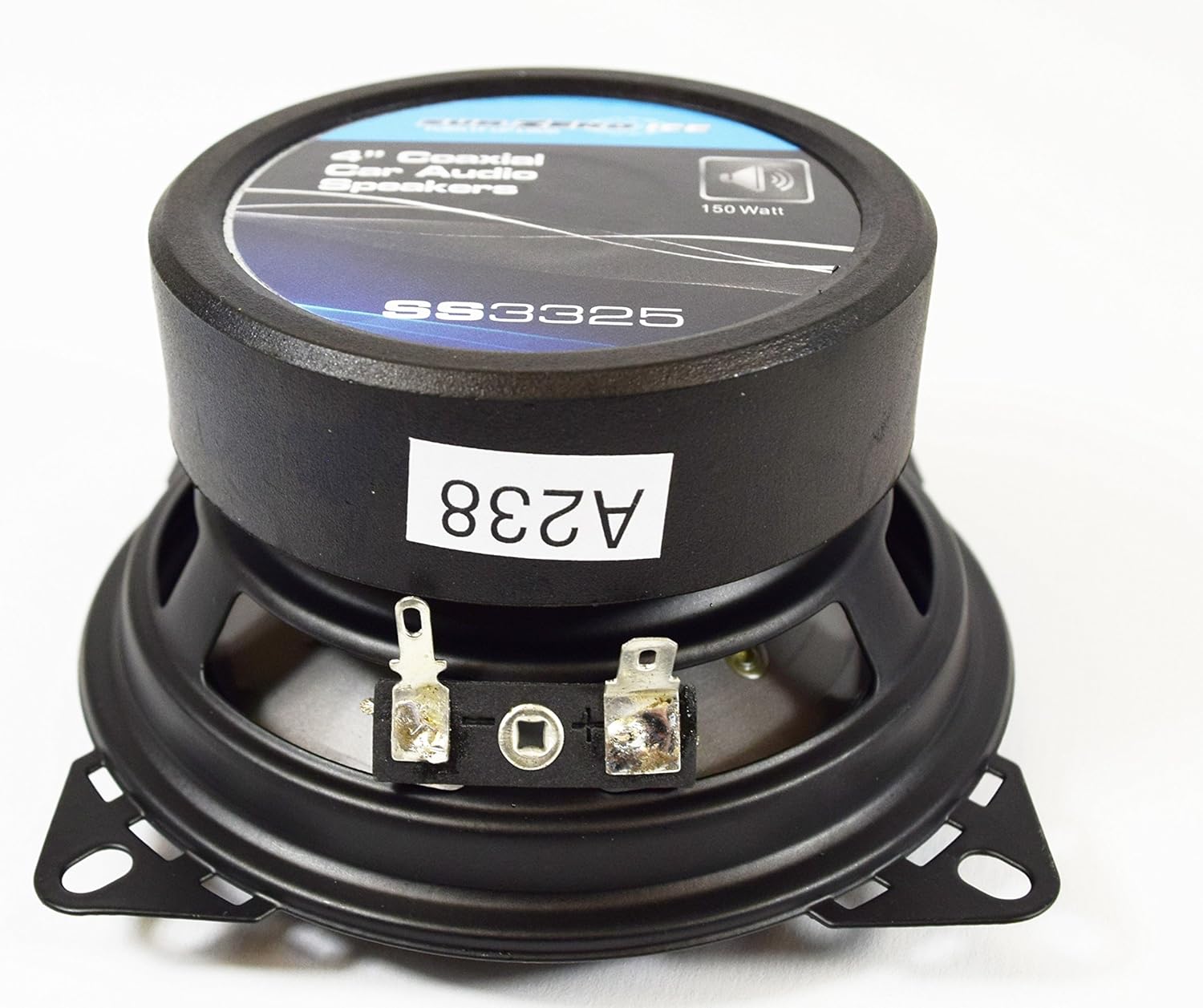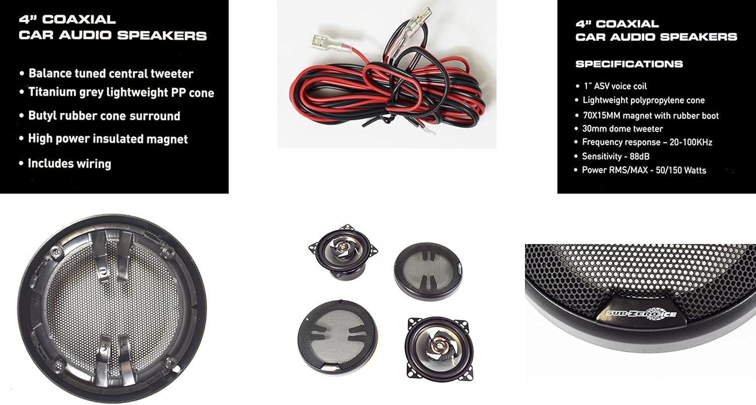 These quality Sub Zero Ice 4″ coaxial car audio speakers are made to the following specifications: 1″ ASV Voice Coil, lightweight polypropylene cone, Frequency response 20-100KHz, Sensitivity – 88dB, Power RMS.MAX 50/150 Watts, 70x15mm Magnet with rubber boot, 30mm dome tweeter. They come packaged in a full colour box complete with instruction manual.
