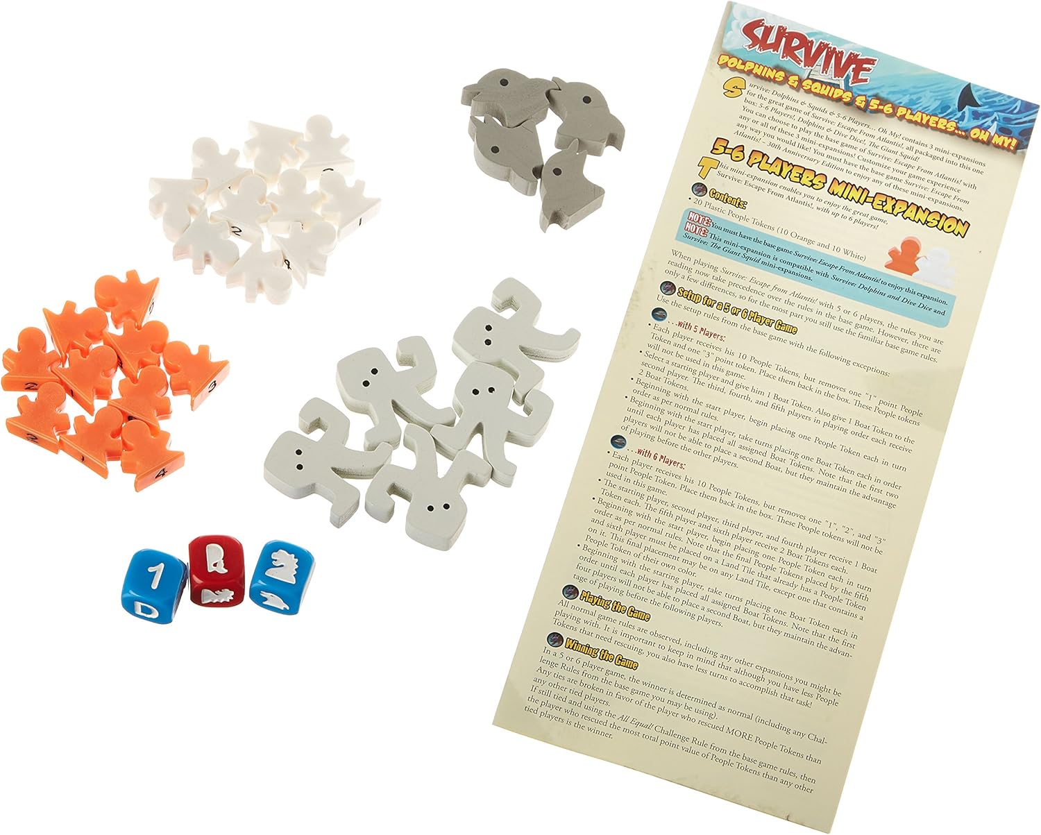 Survive: Dolphins & Squids & 5-6 Players…Oh My! is a collection of three mini-expansions for Survive: Escape from Atlantis! that were previously available separately. These mini-expansions can be used individually or in combination with the base game. NOTE: You must have the base game “Survive: Escape From Atlantis!” to enjoy this expansion.