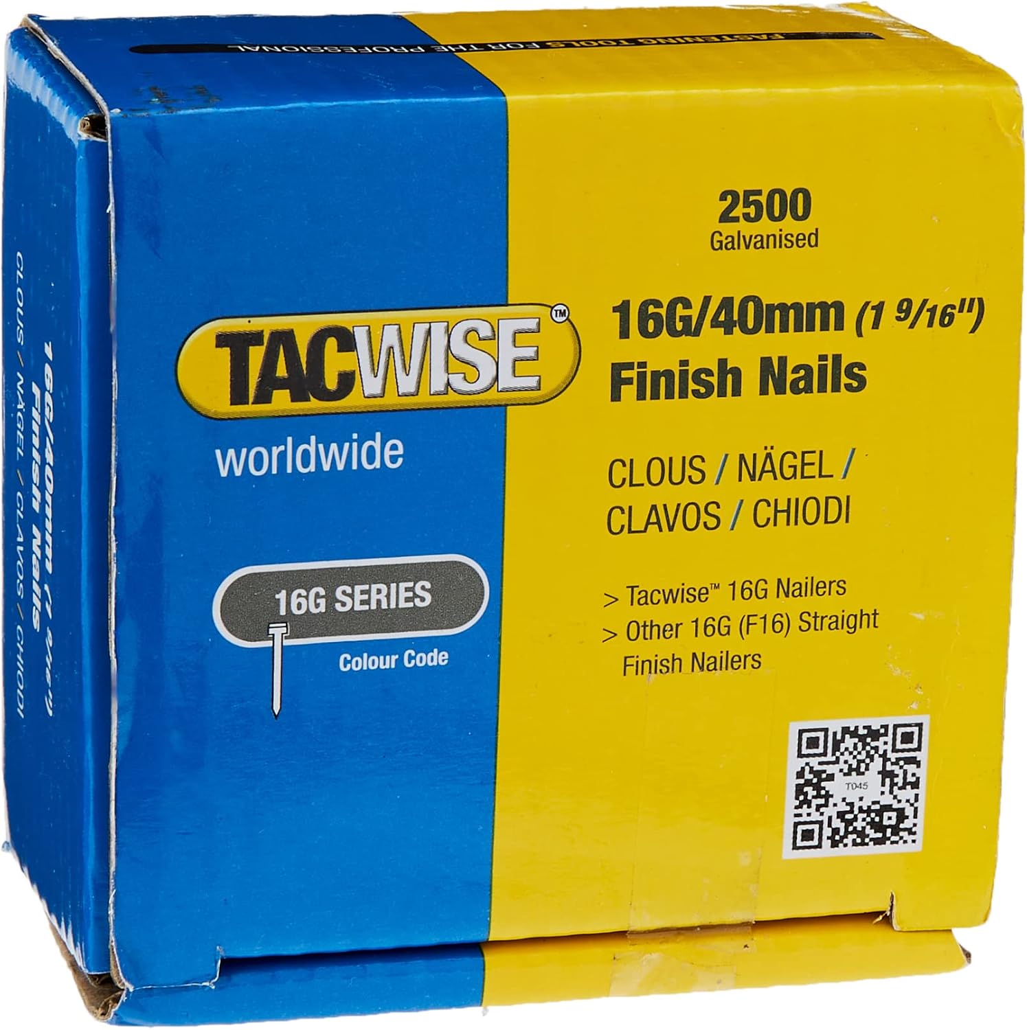 Tacwise 16G Type 160 Finish nails 40 mm in length. These nails packed in 2,500 nails, are suitable for Tacwise DFN50V, FFN64LHH, FCT50LHH and other branded 16 Gauge nail guns including Bostitch, Silverline, Hitatchi and many others