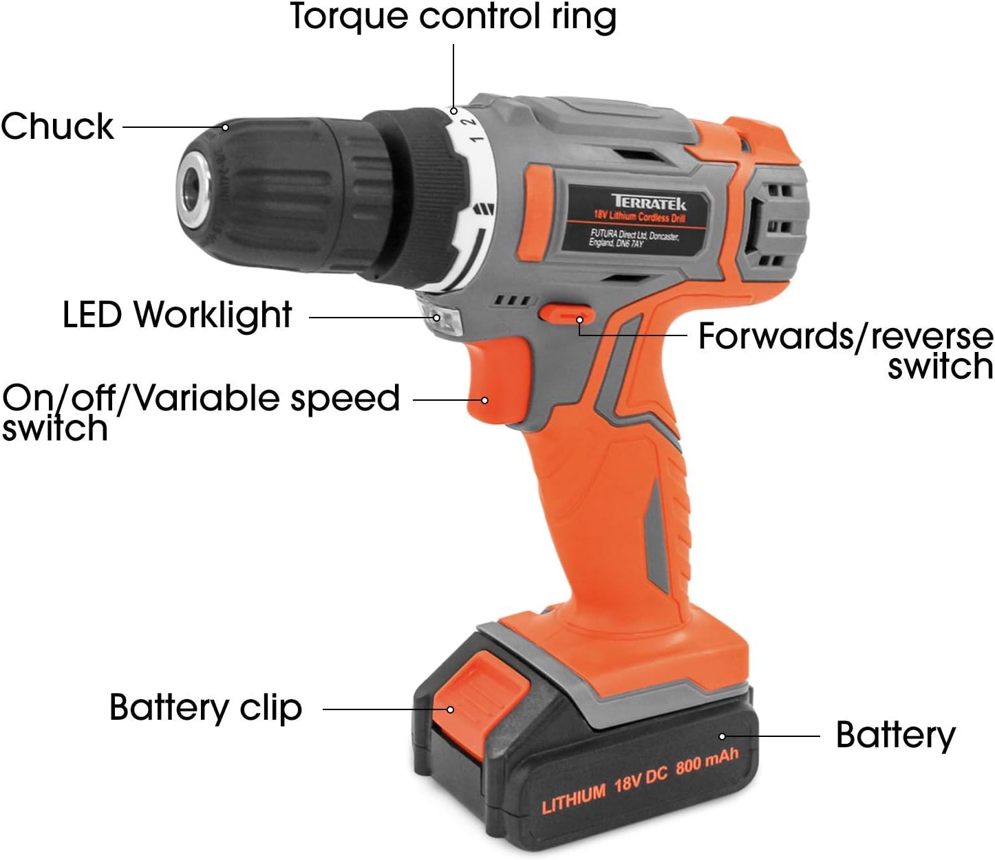 LI-ION POWER: The Terratek 18V/20V Lithium-Ion Cordless Drill Set is supplied with a powerful Li-ion battery which results in having no memory effect, no self-discharge and always ready for use. Peaking at 20V from a fresh charge the battery stabilises to 18V. Equipped with a variable speed pressure trigger which can take your cordless drill up to a no load speed of 650rpm and both forward and reverse levers that enable the drill to quickly switch between drilling and withdrawing of screws.