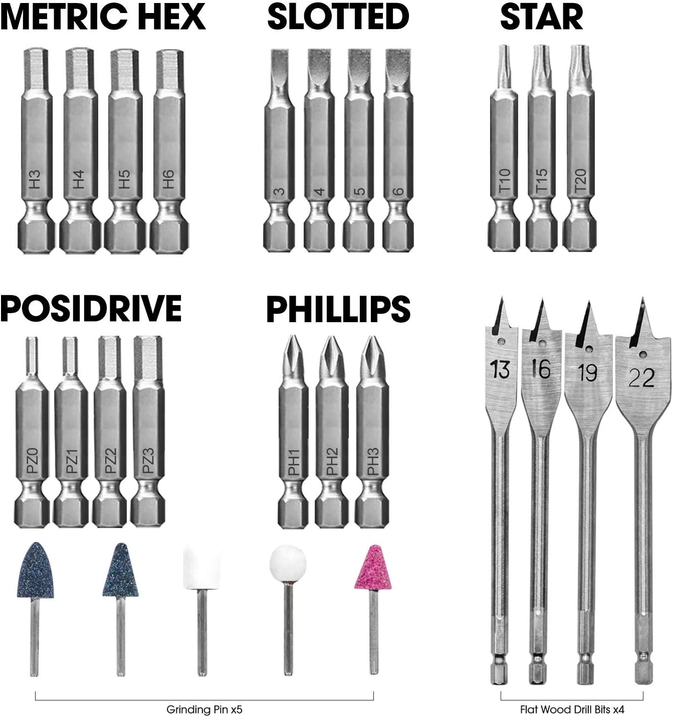 VERSATILE & CARRY CASE: Cordless Drill Set includes is a 89 piece kit that contains 12 x 50mm screwdriver bits, 22 x 25mm screwdriver bits, 10 x wood drills bits, 10 x steel drill bits, 10 x HSS drill bits, 9 x Sockets 5mm – 13mm, 3 x wood spade drill bits, 1 x magnetic bit holder, 1 x adaptor for sockets, 1 x countersink, 3 x steel wire brushes, 2 x adaptor for steel wire brushes, 5 x grinding pins. Comes in a carry case for easy storage.