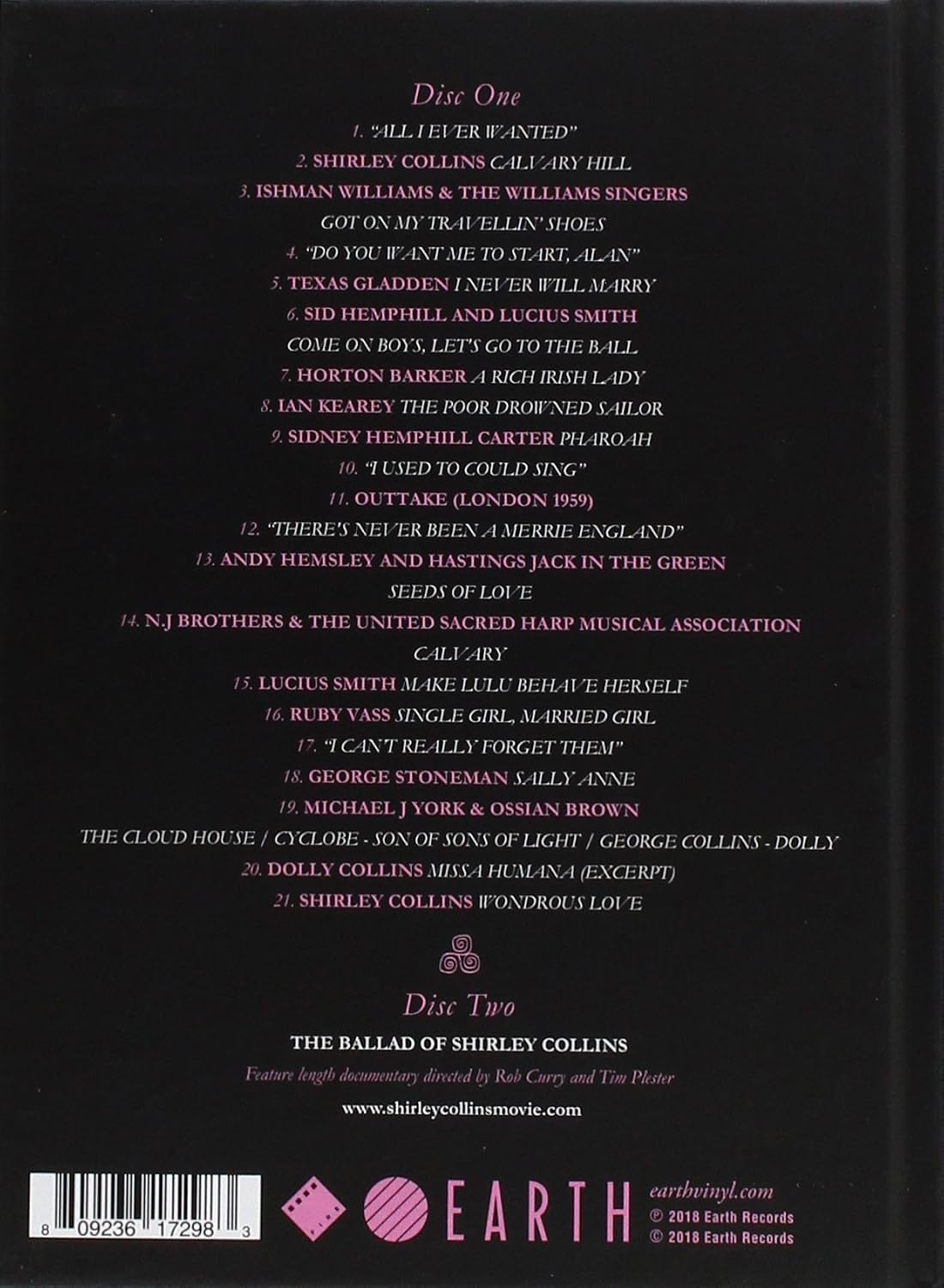 DVD case sized hard back book. LP Pink Vinyl with audio DL // ‘Music Documentary Of The Year’ Louder Than War // ‘One of the great voices in British folk music’ The Guardian // Widely regarded as the 20th century’s most important singer of English traditional song, Shirley Collins is someone who was born to invoke the old songs. Alongside her sister Dolly, she stood at the epicenter of the folk music revival during the 1960s and ’70s. But in 1980 she developed a disorder of the vocal chords known as dysphonia, which robbed her of her unique singing voice and forced her into early retirement. The Ballad Of Shirley Collins which premiered at last year’s London Film Festival tells this story, though to reduce it to that single aspect does everyone (not least of all Shirley!) something of a disservice. The story proves itself to be something of a time-travelling Transatlantic road-movie of sorts, utilising a motherlode of archive audio to recount the tale of her seminal 1959 song-collecting trip around America’s Deep South alongside her then-lover (and legendary ethnomusicologist) Alan Lomax. As well as these songs (notably Alabama Sacred Harp Convention, Texas Gladden and Sidney Hemphill-Carter) there are more recent offerings, a home recording of Shirley’s sister Dolly Collins, and a BBC session from 1958, Eight Five Spiritual which gets its first release, some 60 years after it was recorded. Shirley Collins spent her life in song. Even during her time without her performing voice she was telling the stories of others’ music. Not once has she dropped the baton in keeping these songs, these stories, these people alive. The soundtrack to ‘The Ballad Of Shirley Collins’ though diverse showcases just a fraction of the facets that make up an extraordinary career by anyone’s standards. Deliberately eschewing a straightforward biopic approach, Rob Curry and Tim Plester’s follow-up to their award-winning documentary WAY OF THE MORRIS, is a lyrical response to the life-and-times of this totemic musical figure. Granted intimate access to recording sessions for Shirley’s first album of new recordings in almost four decades, and featuring contributions from the comedian Stewart Lee and David Tibet of Current 93, what emerges is a meditative and carefully textured piece of portraiture. A timely delve into the arterial blood, loam and tears of our haunted island nation. The film was released in October and has played more than 50 venues to date. December brings the last few screenings, before a major new wave of activity in January. January 9th is the date to look out for, with the film showing at around 30 venues across the country. Tracks : 01 "All I Ever Wanted" 02 Shirley Collins – Calvary Hill 03 Ishman Williams & The Williams Singers Got On My Travelling Shoes 04 Do You Want Me To Start, Alan" 05 Texas Gladden – I Never Will Marry 06 Sid Hemphill and Lucius Smith – Come on Boys, Let’s go to the Ball 07 Horton Barker – A Rich Irish Lady 08 Ian Kearey The Poor Drowned Sailor 09 Sidney Hemphill Carter – Pharoah 10 I Used To Could Sing" 11 Outtake (London 1959) 12 "Theres Never Been A Merry England" 13 Andy Hemsley and Hastings Jack in the Green – Seeds of Love 14 N.J Brothers & The United Sacred Harp Musical Association – Calvary 15 Lucius Smith – Make Lulu Behave Herself 16 Ruby Vass – Single Girl, Married Girl 17 I Can’t Really Forget Them" 18 George Stoneman – Sally Anne 19 Michael J York & Ossian Brown – The Cloud House / Cyclobe – Son Of Sons of Light / George Collins Dolly 20 Dolly Collins – Missa Humana (excerpt) 21 Shirley Collins – Wondrous Love