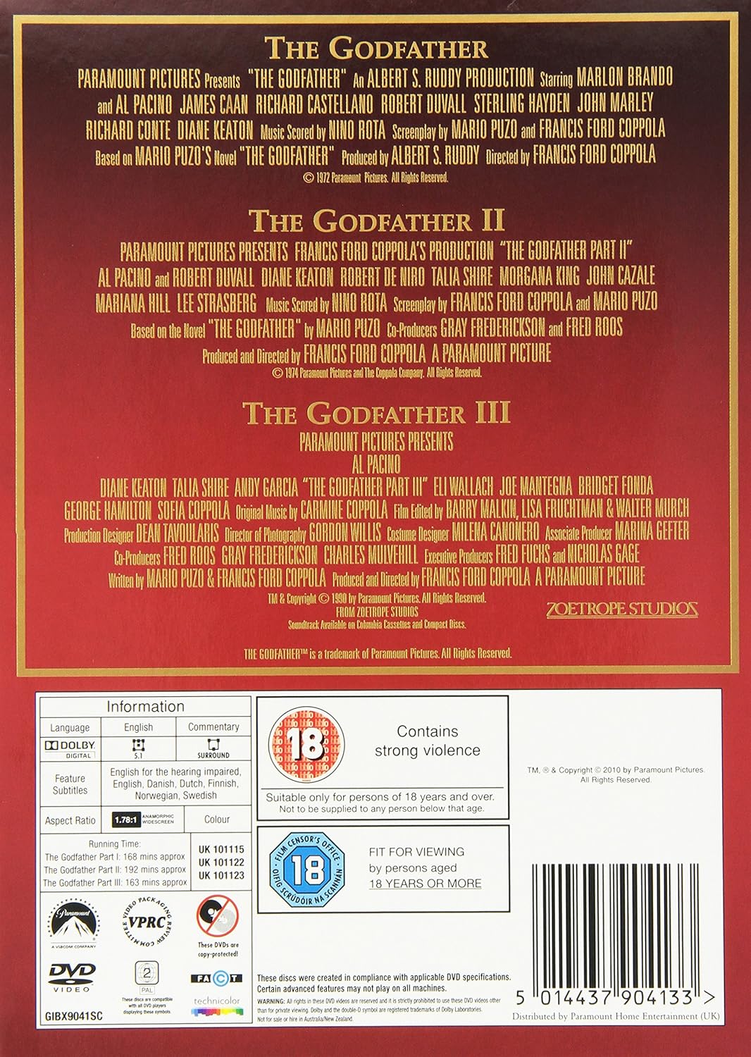 The Godfather: (1972)Considered by many to be the greatest movie ever made, Francis Ford Coppola’s epic masterpiece features Oscar winner Marlon Brando as the head of the Corleone family. Coppola paints a chilling portrait of a Sicilian family’s rise and near fall from power in America, and the passage of rites from a father to a son who was previously uninvolved in the business.Godfather Part II: (1974)The Godfather Part II is one of the rare breed of cinematic sequels which is as good as, and perhaps better than, the original. Al Pacino heads the star cast as Michael Corleone, heir to the criminal empire established by his Mafioso father, the late Don Corleone.Michael is now in charge of all gambling activities in Nevada, making certain that any and all political or mob enemies are quickly bought off, compromised, or disposed of. Throughout the film, Michael’s travails are paralleled with the early experiences of his father, played in flashbacks by Robert DeNiro.The Godfather III: (1990)In the final instalment of the Godfather Trilogy, an aging Don Michael Corleone seeks to legitimise his crime family’s interests and remove himself from the violent underworld.Now in his sixties, Michael is dominated by two passions: freeing his family from crime, and finding a suitable successor. That successor could be fiery Vincent (Andy Garcia)… but he may also be the spark that turns Michael’s hopes of business legitimacy into an inferno of mob violence.