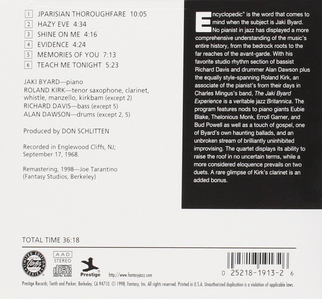 “Experience” is an apt description of this 1968 monster, more a mystical rendezvous with the Ghosts of Jazz Past, Present, and Future than a mere record album. Pianist Jaki Byard certainly had a kindred spirit in hornman Roland Kirk, another fiercely diverse player who never met a jazz he didn’t like–or know how to play. Our journey begins with a 10-minute reading of Bud Powell‘s “Parisian Thoroughfare” that’s more beyond than it is bop. “Hazy Eye” follows, a lovely meditative duet with Byard and bassist Richard Davis, before the quartet (with Alan Dawson on drums and Kirk adding a rare turn on clarinet) reveals the earthy gospel “Shine on Me,” taken half-boogie, half-funky. Just as you settle into a groove, a wild, frenzied version of Thelonious Monk‘s “Evidence” tans your hide as both Byard and Kirk offer whirling, wondrous improvisations. The climax is Eubie Blake‘s beautiful ballad “Memories of You,” a duet for Byard and Kirk that is both stately and stirring. The full quartet waves goodbye with a midtempo “Teach Me Tonight,” complete with a nod to Erroll Garner. You can still see the devilish smiles. –Marc Greilsamer