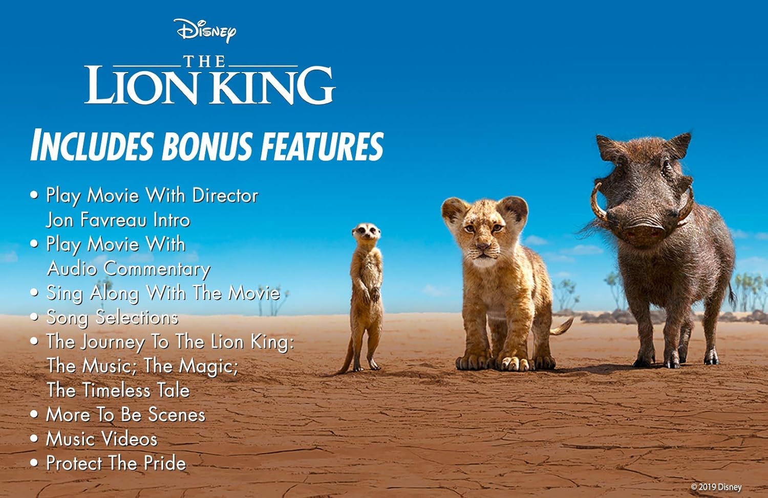 SYNOPSISDisney’s “The Lion King, directed by Jon Favreau, journeys to the African savanna where a future king is born. Simba idolizes his father, King Mufasa, and takes to heart his own royal destiny. But not everyone in the kingdom celebrates the new cub’s arrival. Scar, Mufasa’s brother—and former heir to the throne—has plans of his own. The battle for Pride Rock is ravaged with betrayal, tragedy and drama, ultimately resulting in Simba’s exile. With help from a curious pair of newfound friends, Simba will have to figure out how to grow up and take back what is rightfully his. The all-star cast includes Donald Glover as Simba, Beyoncé Knowles-Carter as Nala, James Earl Jones as Mufasa, Chiwetel Ejiofor as Scar, Seth Rogen as Pumbaa and Billy Eichner as Timon. BONUS FEATURESPlay Movie with Director Jon Favreau IntroPlay Movie with Audio CommentarySing Along with The MovieSONG SELECTION: “Circle of Life”SONG SELECTION: “I Just Can’t Wait to Be King”SONG SELECTION: “Be Prepared”SONG SELECTION: “Hakuna Matata”SONG SELECTION: “Can You Feel the Love Tonight”SONG SELECTION: “Spirit”SONG SELECTION: “Never Too Late”The Journey to The Lion King: The MusicThe Journey to The Lion King: The MagicThe Journey to The Lion King: The Timeless TaleMore To Be Scene: “Circle of Life”More To Be Scene: “I Just Can’t Wait To Be King”MUSIC VIDEO: “Never Too Late” By Elton JohnMUSIC VIDEO: “Spirit” Performed by BeyonceProtect The PrideMore To Be Scene: “Hakuna MatataSONG SELECTION: “The Lion Sleeps Tonight”