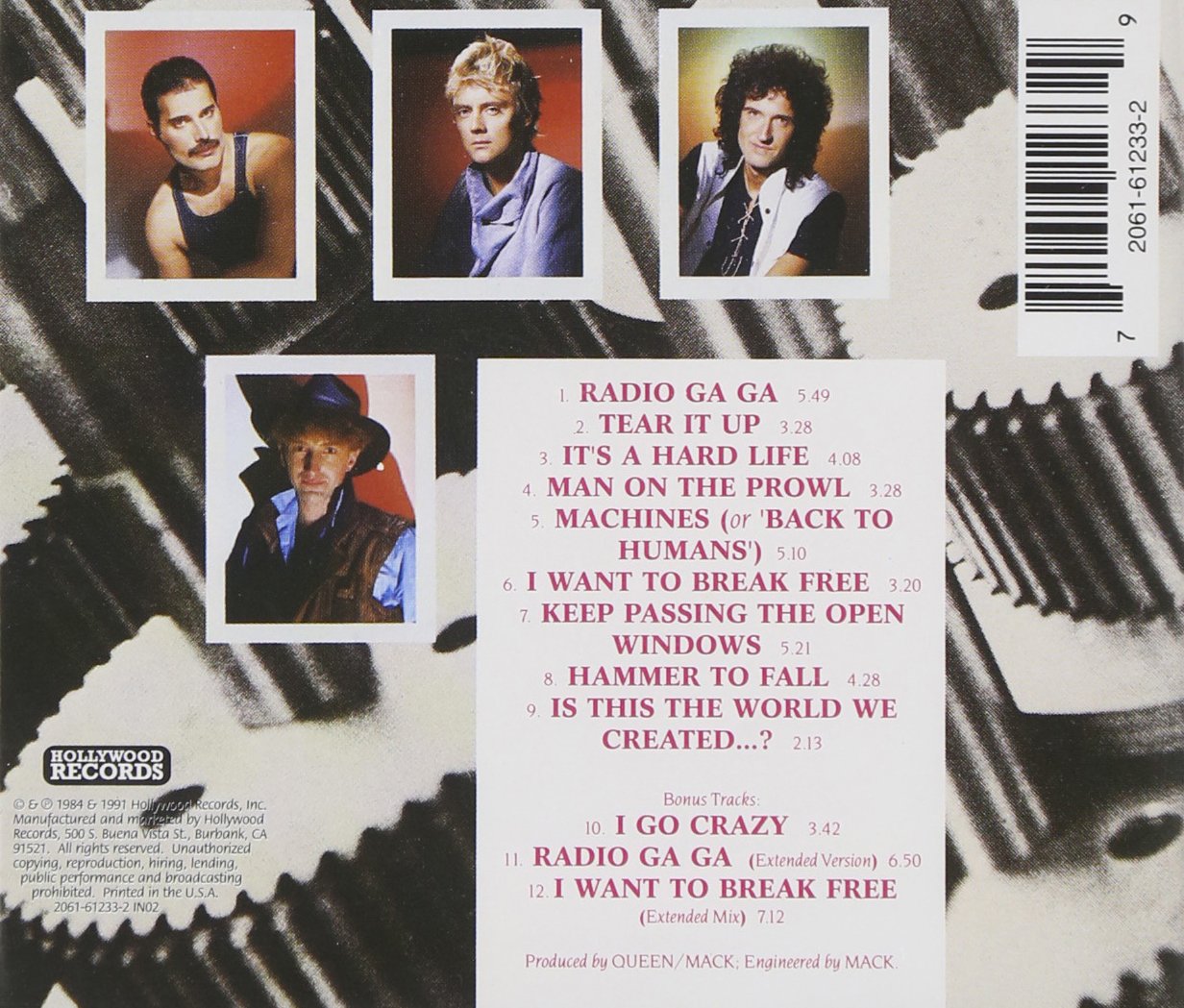 Queen: Brian May (vocals, guitar); Freddie Mercury (vocals, piano); Roger Taylor (vocals, drums); John Deacon (bass). Additional personnel: Fred Mandel (piano, synthesizer, programming). Recorded at the Record Plant, Los Angeles and Musicland Studios, Munich from August 1983-January 1984. Personnel: Brian May (vocals, guitar, banjo, keyboards); Freddie Mercury (vocals, piano); Roger Taylor (vocals, drums); John Deacon (guitar); Fred Mandel (piano, synthesizer). Unknown Contributor Roles: Fred Mandel; Queen. With their previous album (HOT SPACE) confusing many of their fans, Queen had something to prove on THE WORKS. The band definitely succeeded at getting back on track–THE WORKS was one of the best rock releases of 1984, featuring the worldwide smash “Radio GaGa” and reintroducing their fans to Queen’s classic sound. THE WORKS spawned a total of four U.K. top ten singles, confirming that Queen had returned from their short hiatus in fine form. Almost all of the elements you’ve come to expect from a classic Queen release are present on here. “I Want To Break Free” and “It’s A Hard Life” are instantly addictive pop-rock. “Tear It Up” is a straight-ahead rocker and “Machines (Back To Humans)” is a successful electronic rock experiment. And as on the majority of latter-day Queen albums, there are a few politically charged tunes. “Hammer To Fall,” became an instant concert favorite with it’s merger of melodic hard rock and a sing-a-long chorus, but the lyrics deal with the impending danger of nuclear build-up. The other, “Is This The World We Created?,” consists of just vocals with acoustic guitar accompaniment, and closes the otherwise upbeat album on a somber note.