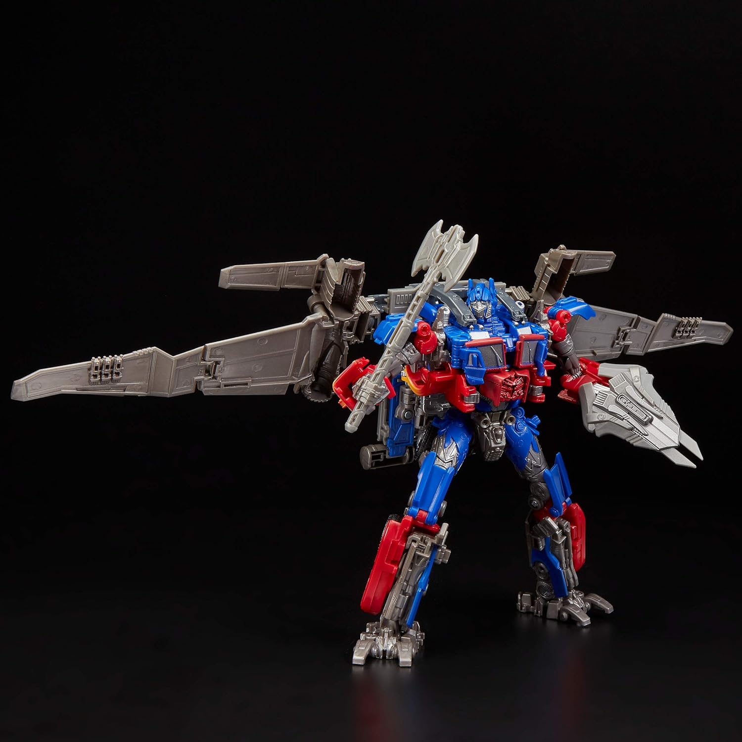this Studio series 44 leader class Optimus Prime figure features vivid, movie-inspired Deco and converts from robot to truck mode in 44 steps. Truck trailer converts into jetwing Tech to form jetwing Optimus Prime. Remove backdrop to showcase Optimus Prime in the battle of Chicago scene. Includes 5 detailed accessories: 2 blasters, 2 energy weapons, and shield. For kids age 8 and up!