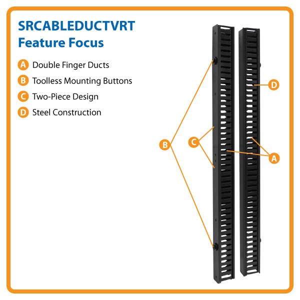 The SRCABLEDUCTVRT features a split design that allows it to be installed either as a 6-ft. single piece or two 3-ft. pieces, providing a wide range of installation flexibility. It also features toolless mounting buttons, allowing it to integrate seamlessly into racks that support toolless mounting.