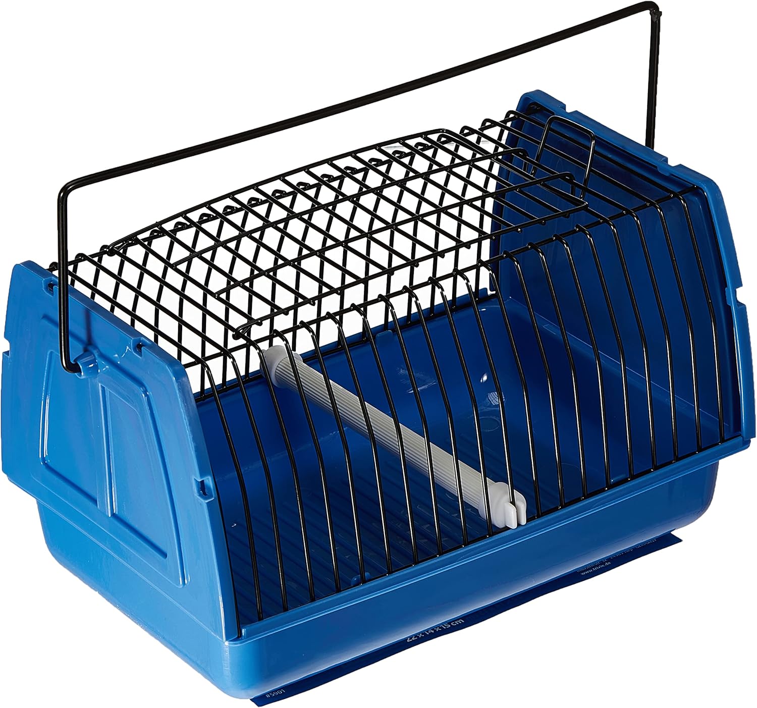 Transport box for small birds and small animals. It is made from plastic material and ideal for carrying the pet to the vet. It can be opened at the top. Comes with handle and removable perch. Grids are made from metal and comes in black colour. Measures 22 cm length by 14 cm width by 15 cm height.
