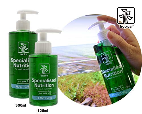 Tropica Specialised Fertiliser contains all essential nutrients needed including nitrogen (N) and phosphorus (P). Specialised Fertiliser is suitable for aquariums with many plants in relation to the number of fish, where plants can lack nitrogen (N) and phosphorus (P) which otherwise would be supplied by fish excrement and food remnants. Specialised Fertiliser is composed so that N and P in particular are supplied to the plants in the amounts and chemical forms the plants require for optimal absorption and growth. The waterplant fertilizer has been developed for plants which easily absorb nutrients from the water via the leaves, which typically are the low, compact foreground plants. The fertilizer also contributes to the supply of the nutrition large stem and rosette plants require. Specialised Fertiliser is added each week when the water is changed. We recommend 5 mL per 50 L water. However, we recommended that this is set in accordance with plant requirements. Specialised Fertiliser