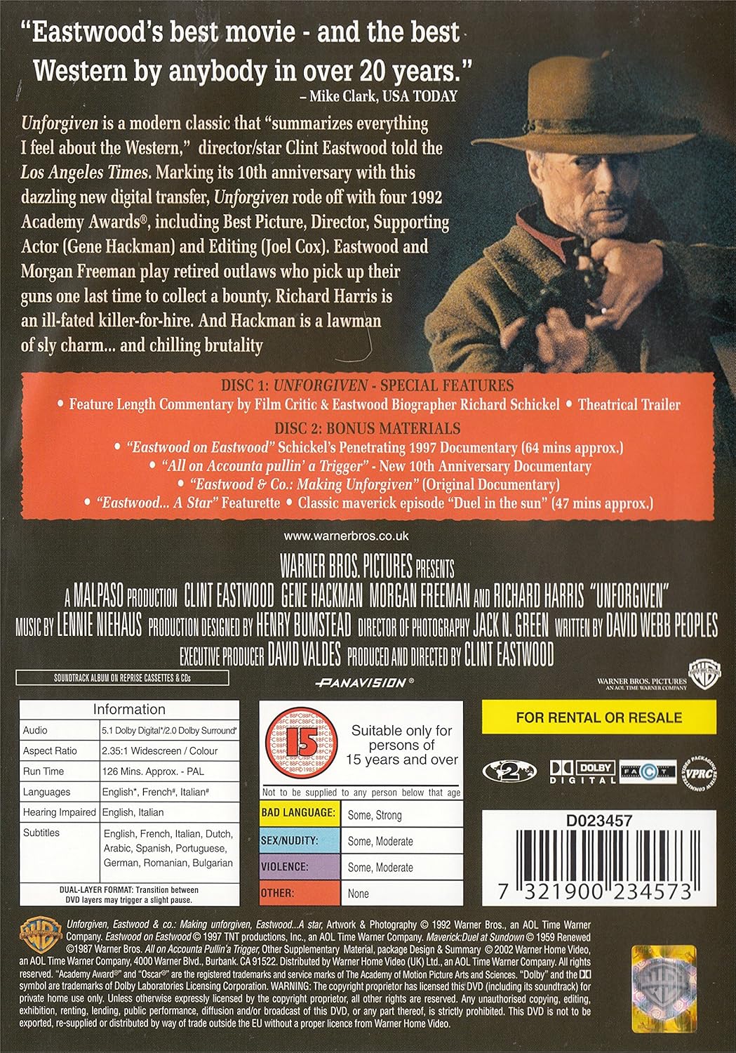 Winner of four Academy Awards, including best picture, director, supporting actor and best editing, Clint Eastwood’s 1992 masterpiece stands as one of the greatest and most thematically compelling Westerns ever made. “The movie summarised everything I feel about the Western,” said Eastwood at the time of the film’s release. “The moral is the concern with gunplay.” To illustrate that theme, Eastwood stars as a retired, once-ruthless killer-turned-gentle-widower and hog farmer. He accepts one last bounty-hunter mission–to find the men who brutalised a prostitute–to help support his two motherless children. Joined by his former partner (Morgan Freeman) and a cocky greenhorn (Jaimz Woolvett), he takes on a corrupt sheriff (Oscar winner Gene Hackman) in a showdown that makes the viewer feel the full impact of violence and its corruption of the soul. Dedicated to Eastwood’s mentors Sergio Leone and Don Siegel and featuring a colourful role for Richard Harris, Unforgiven is arguably Eastwood’s crowning directorial achievement. –Jeff Shannon