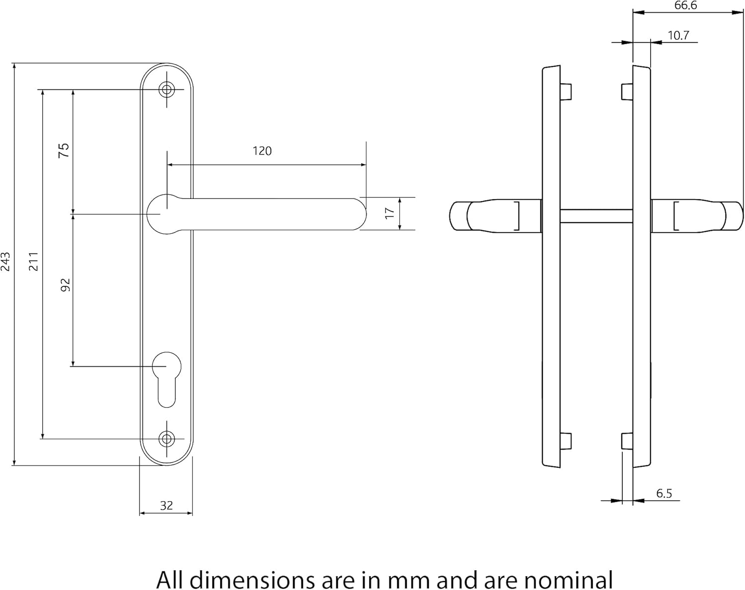 uPVC Door Handles Set Lever/Lever White 92pz – 210mm Screw to Screw – Back Plate 240mm These are a suitable replacement for the now no longer manufactured 205mm handles. A small hole will have to be drilled if you are using them as the replacement in order for it to fit. If you are replacing this handle like for like, no drilling etc. will be required. Exterior door furniture set (internal lever and external lever) to suit euro design key cylinders (light bulb shape cylinder). This handle will fit the uPVC type door requiring the lift-to-lock motion to engage the multi-point locks up the side of the door. Levers are unsprung. Be sure that it fits Not all handles fit all multi-point mechanisms. Before ordering, check distance from centre of spindle to centre of cylinder barrel (PZ) and distance between fixing screws. Centre of spindle to centre of cylinder barrel = 92mm (92 PZ) Distance between fixing screws = 210mm Notes: * 100 000 test cycles relates to a handle mounted correctly on a door with one open/close motion = 1 cycle. Can be used in coastal environments and highly frequented areas such as public buildings shops and hotels. Please note special cleaning is not necessary as dirt can be removed with a damp cloth. The use of caustic cleaners or chemicals should be avoided.