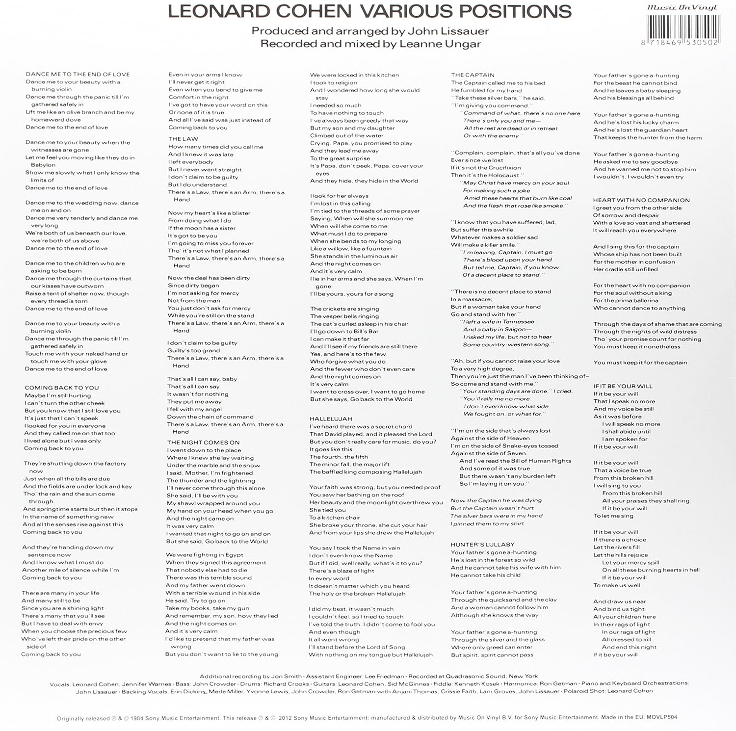Heavyweight 180gm vinyl LP repressing of this 1985 album. Recorded with vocalist Jennifer Warnes, Various Positions is a stunning return to form. Cryptic and raw, Various Positions is an eclectic set ranging from the Gainsbourg-esque pop ballad of “Dance Me to the End of Love” to the classic “Hallelujah”.