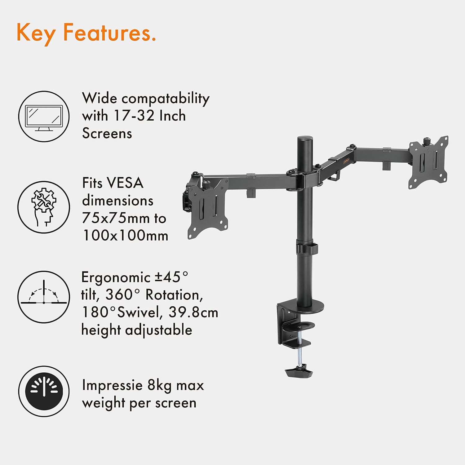 VonHaus Dual Monitor Mount for 13-32” Screens – Double Arm Desk Stand Bracket with Clamp – Ergonomic 180° Tilt, 360° Rotation & Twin 360° Swivel Arms – VESA Dimensions: 75×75-100×100