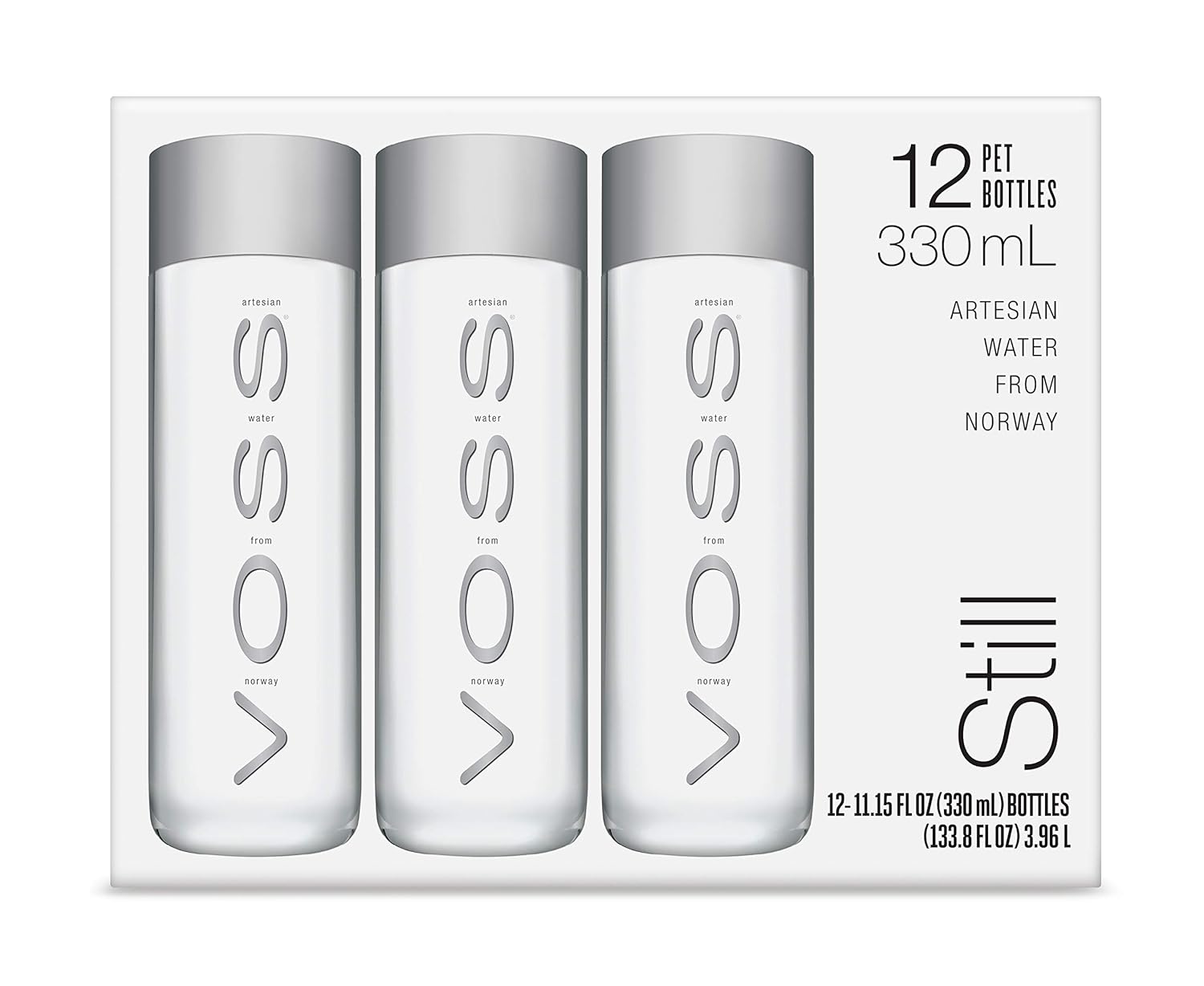 - Contains twelve, 330 ml bottles of VOSS artesian water from Norway