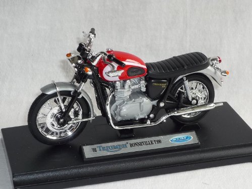 Welly 2002 Triumph Bonneville T100 1/18 Scale Diecast Model Motorcycle. The Bonneville T100 is a motorcycle designed and built in Hinckley, Leicestershire by Triumph Motorcycles Ltd. The T100 Bonneville, styled by John Mockett and David Stride, was launched as an updated version of the Bonneville 790, initially with the 790 cc engine and from 2005 with the 865 cc engine introduced on the 2004 Thruxton, and fitted to all Bonnevilles from 2007. The “T100” designation comes from the top speed of 100 mph (160 km/h) and it is sold as part of Triumph's "Modern classics" range. Die-cast metal model motorbike with plastic parts. Manufactured by Welly in precise 1/18 scale. Moving parts include; working steering, working rear suspension, a working stand and soft rubber tyres. All in excellent detail! Altogether a perfect model measuring about 12cm long and 6cm high. The model is mounted on a plastic stand with a name plinth. It is complete with card display box. A fine example of this classic motorcycle.