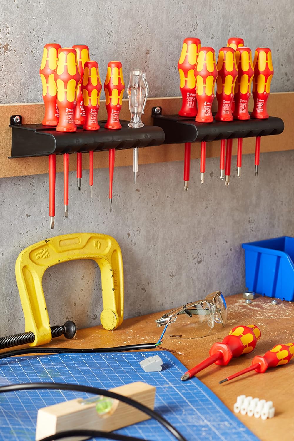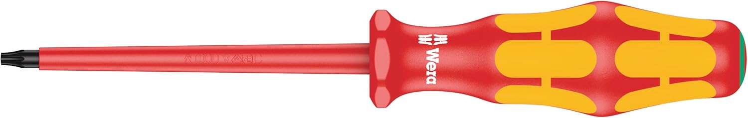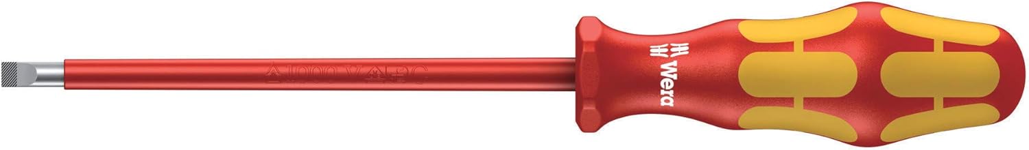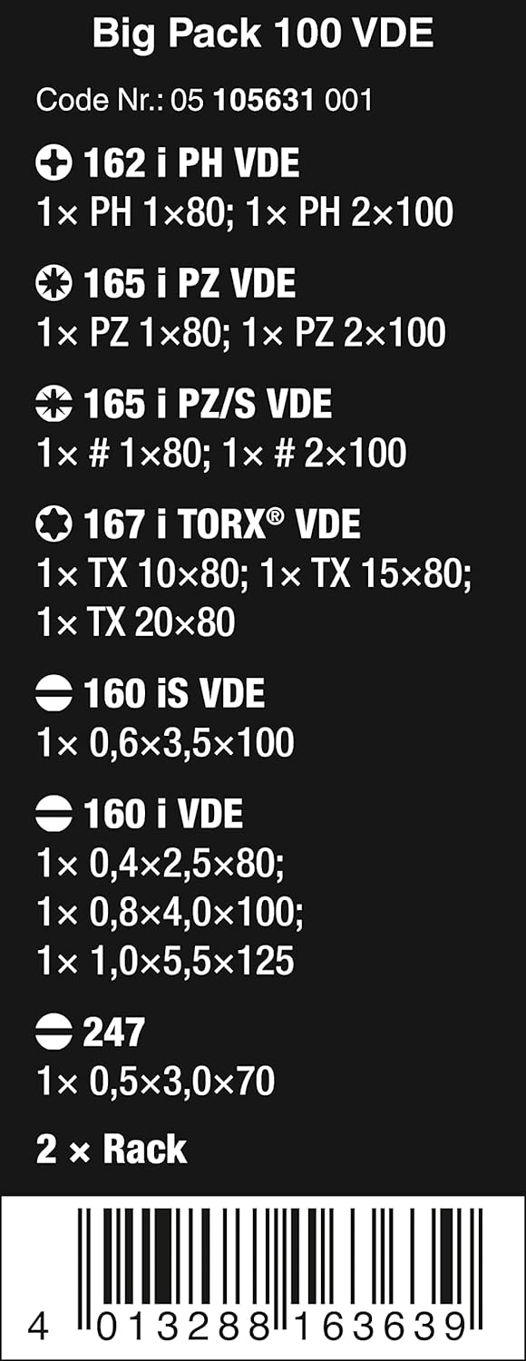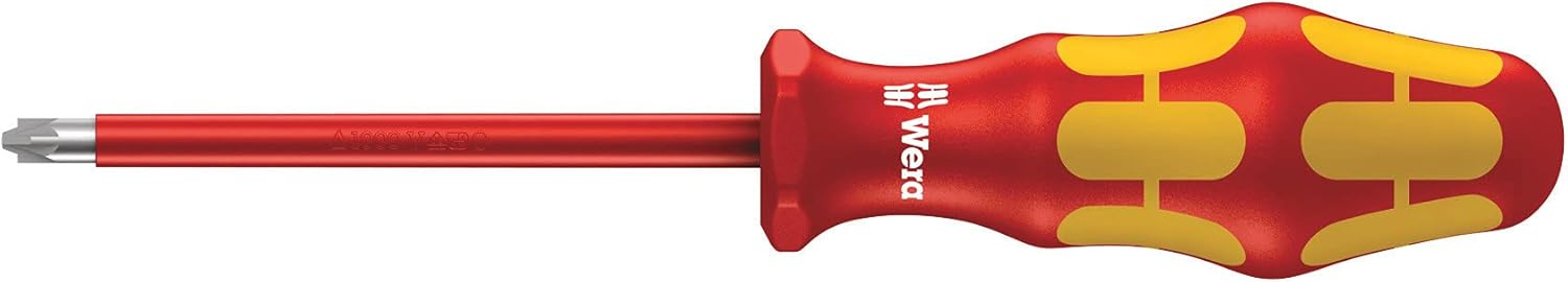 16-piece screwdriver set with individually tested, insulated screwdrivers as per IEC 60900. Individual testing in a water bath at 10,000 volts so as to ensure safe working at the permitted voltage of 1,000 volts. Kraftform Plus handle for pleasant, ergonomic working that prevents blisters and calluses. Hard gripping zones for high working speeds whereas soft zones ensure high torque transfer. The anti-roll feature prevents any bothersome rolling away at the workplace. Partially Laser tip: the tip literally bites into the head of the screw and thereby prevents any slipping out of the screw head. Includes voltage tester and 2 racks for storage.