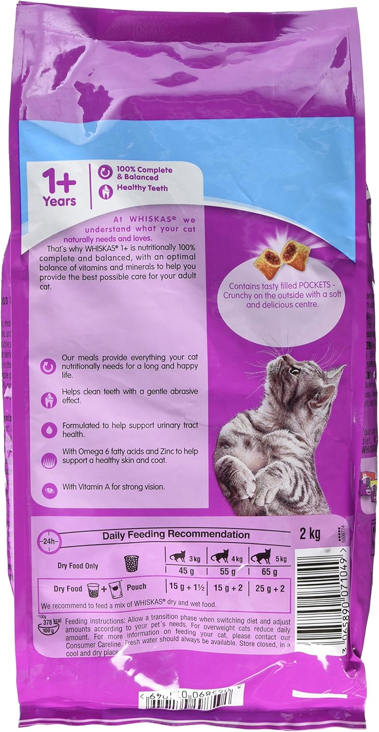 Whiskas complete tuna cat food dry 2kg whiskas is one of the most popular brands of cat food available. Cat’s just seem to love it! delicious and great for your adult pussy cat, whiskas adult dry range contains enriching ingredients that are lovely and crunchy. With this2kg supply of whiskas complete tuna cat food dry, your furry friend will be smacking his lips and thanking you! fibre in the food expands in the stomach, making your cat feel full! there are many benefitting ingredients that will help your cat to stay healthy and strong. Dry cat food is a great alternative to normal tinned food as it lasts much longer. If you are leaving your puss alone whilst at work, dry food is good for putting down for your cat to graze, especially for use in gravity feeders. Suitable for adult cats. Benefiting features: natural oils vitamins protein fibre flavour: tuna weight: 2kg nutrition: moisture 6% fibre 1.5% protein 37% fat 12% carbohydrate38% magnesium 0.07% sodium 0.92% calcium 1.11% phosporus 0.9%.